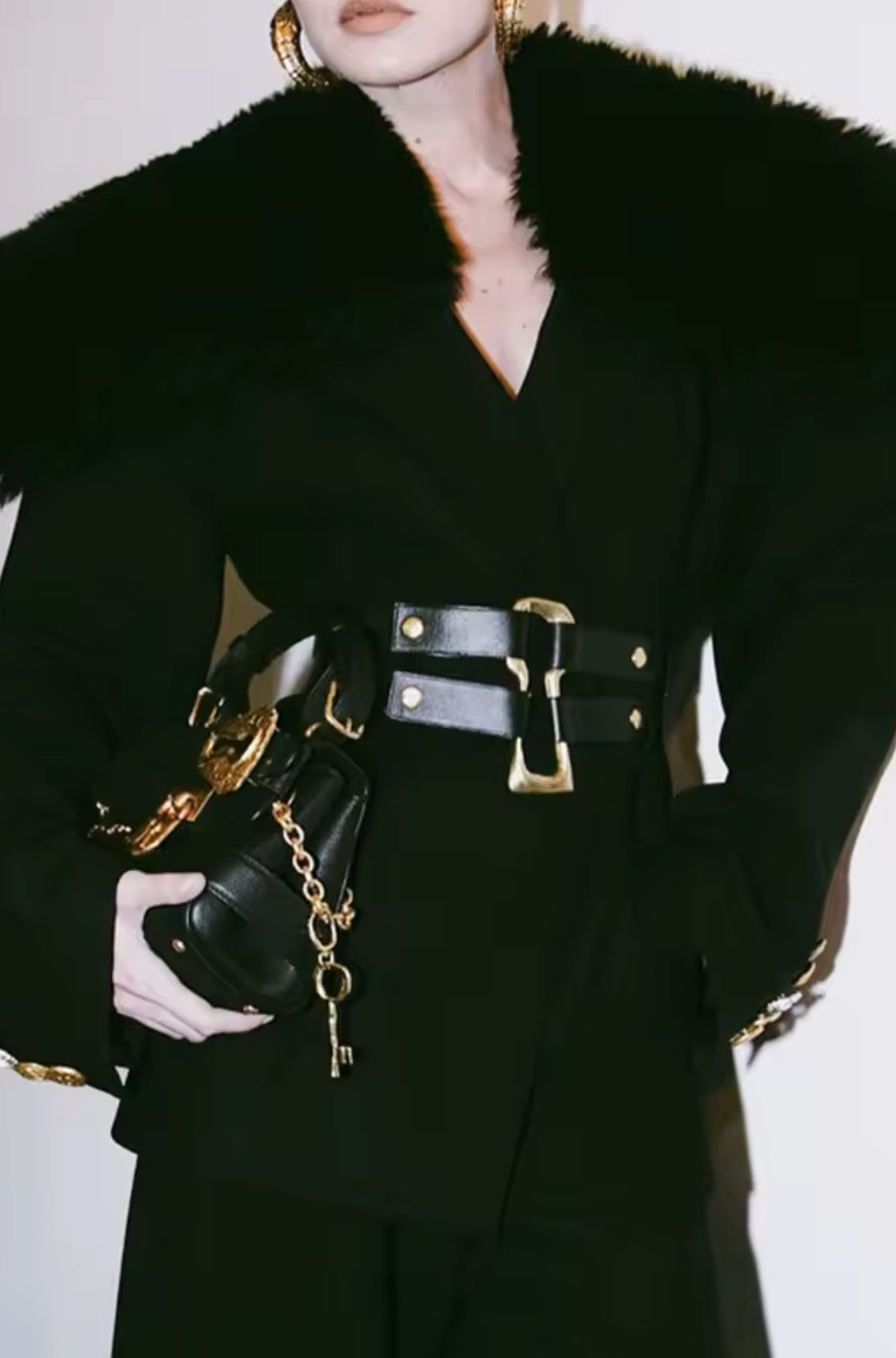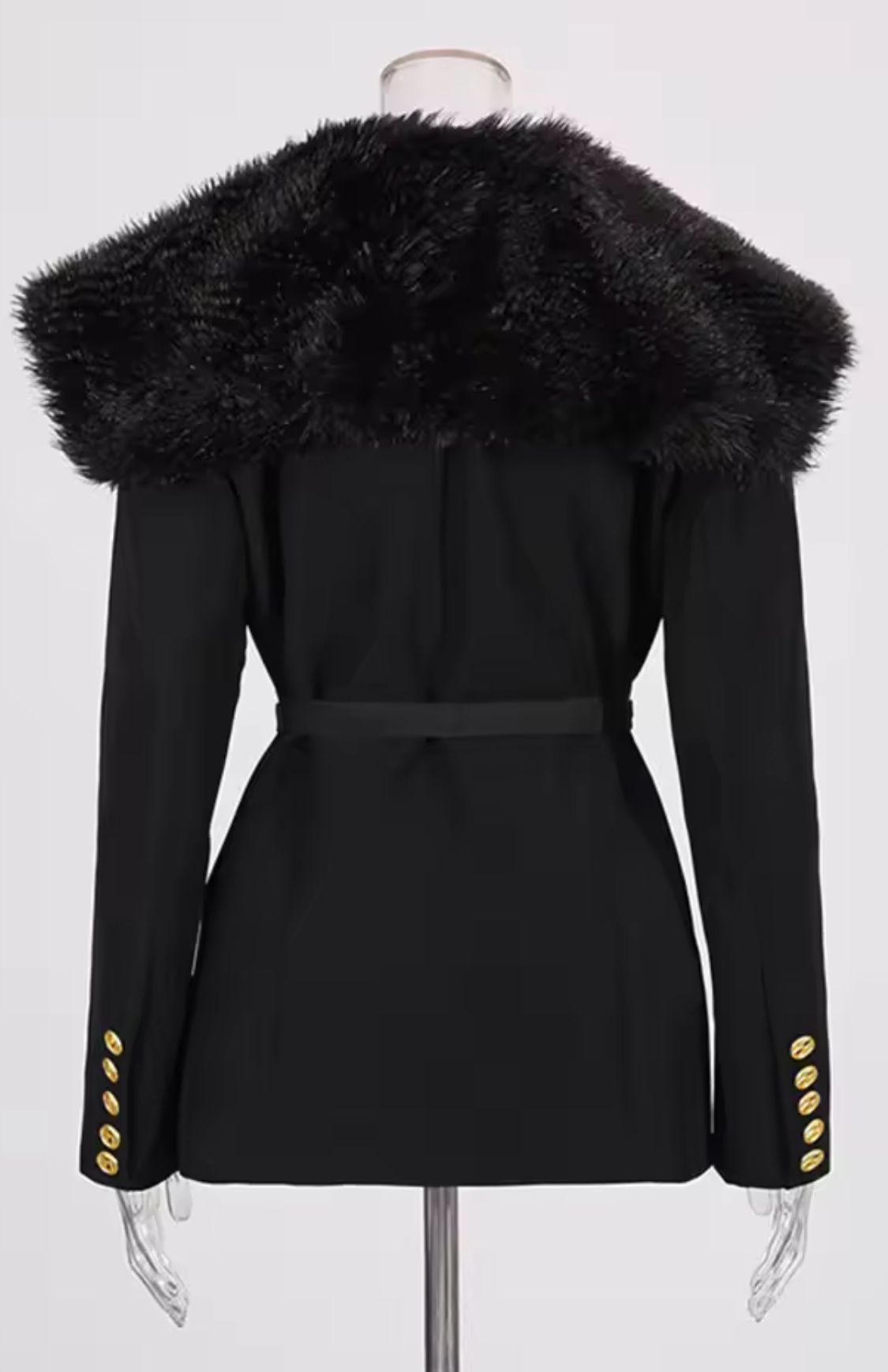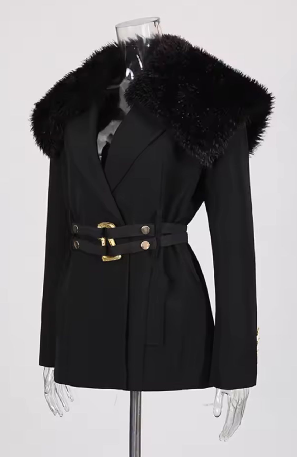 Abrigo negro con pelo en cuello con cinturón con hebilla metálica dorada