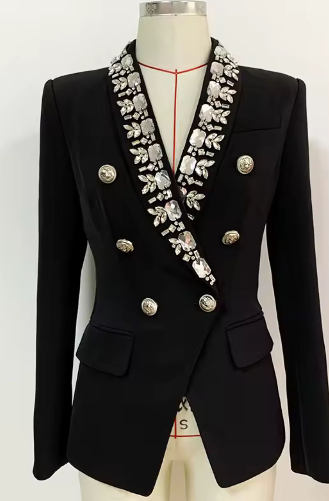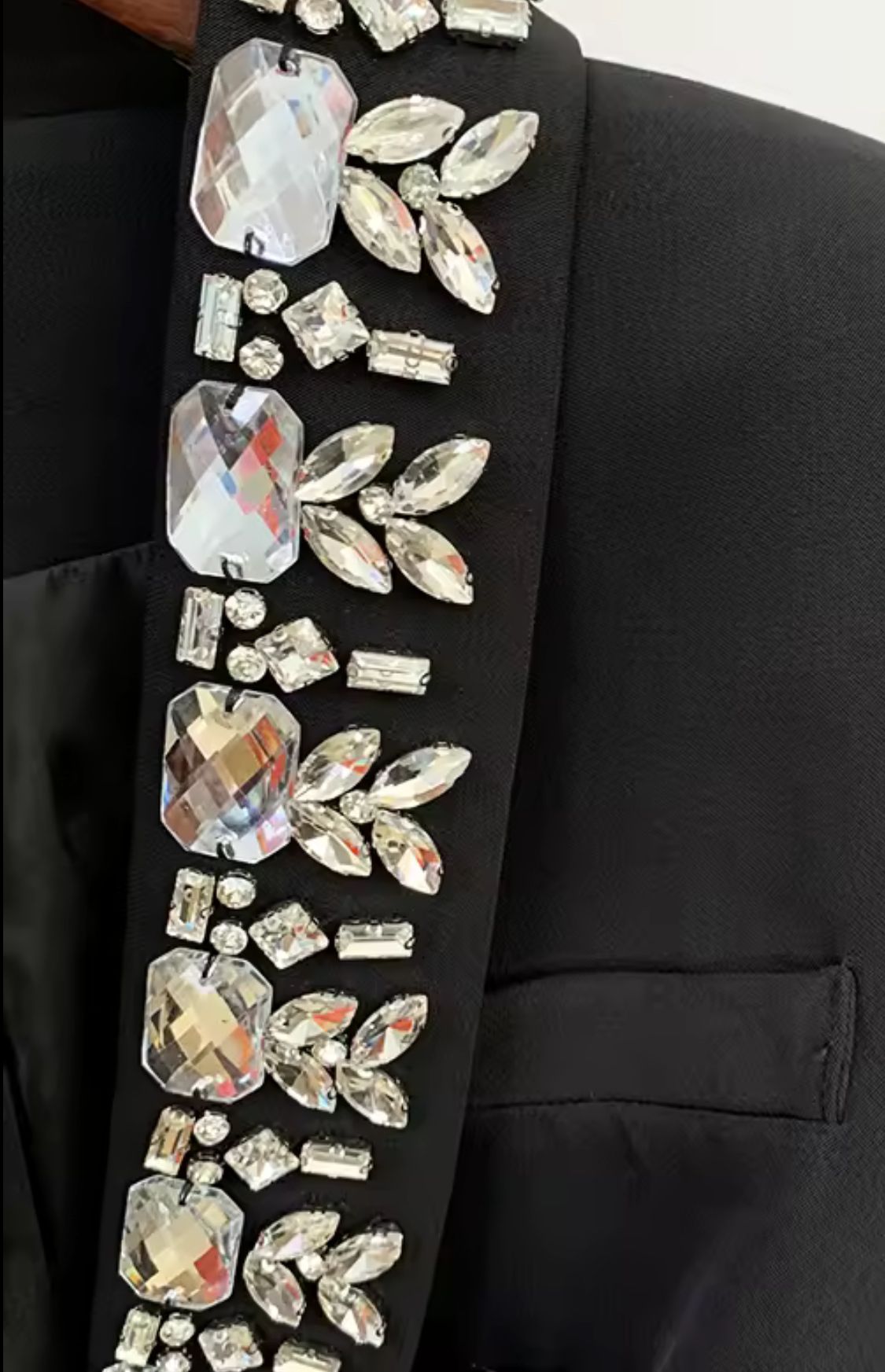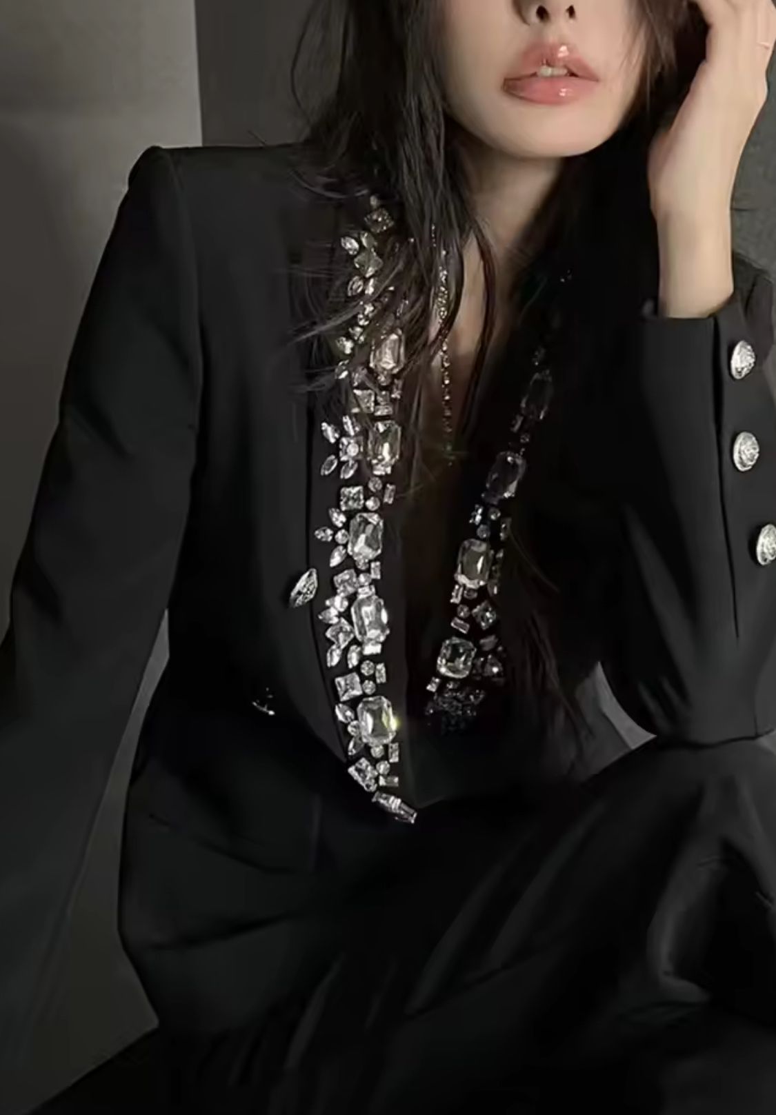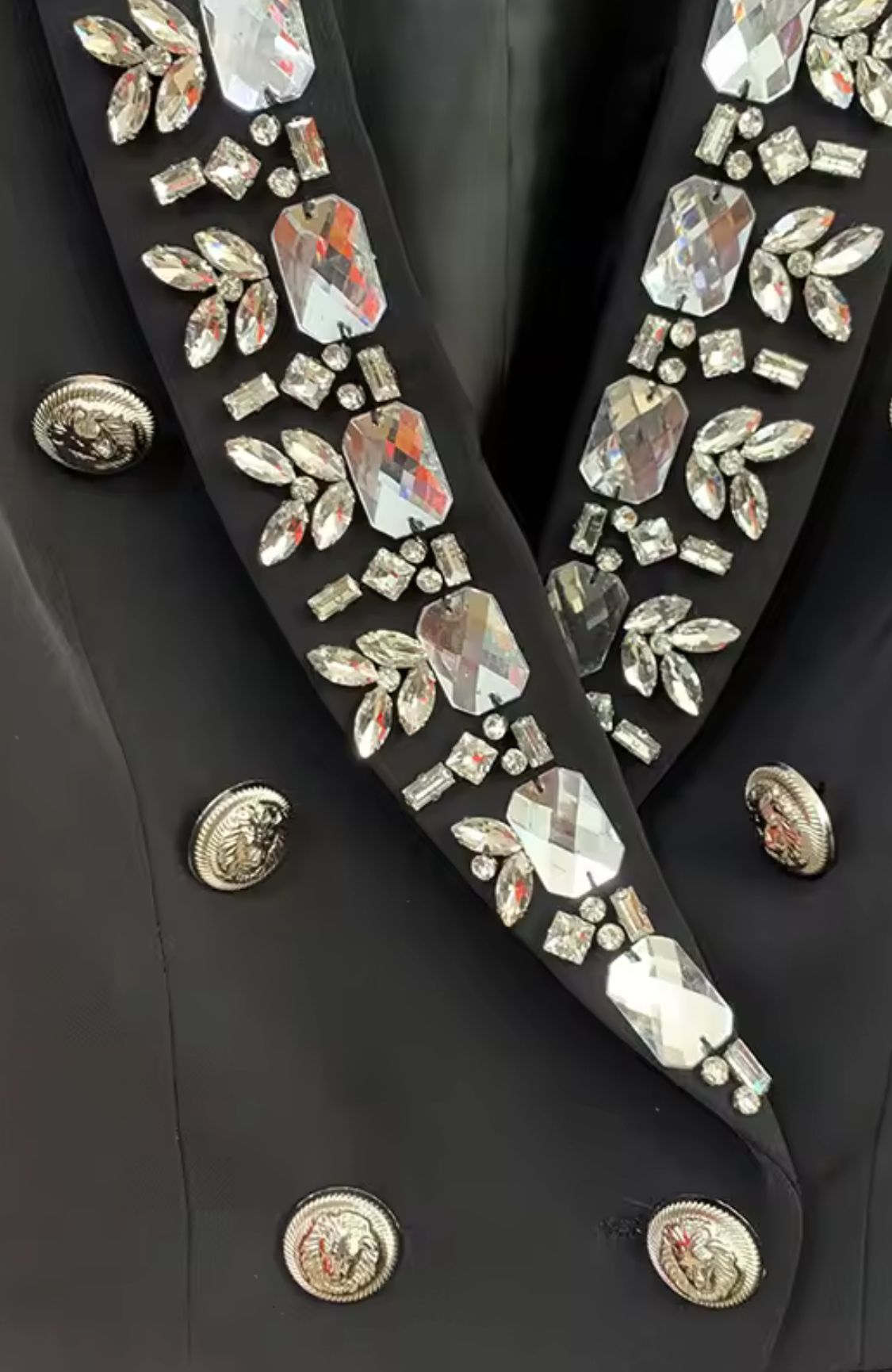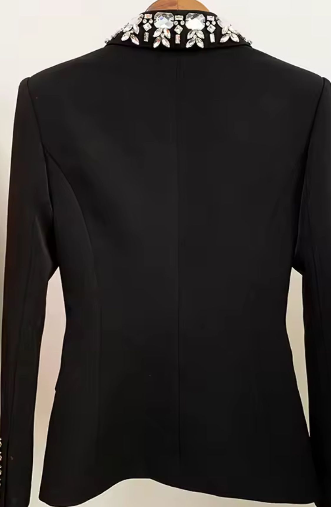 Esta exquisita americana negra es la pieza clave para un look sofisticado y lleno de glamour.