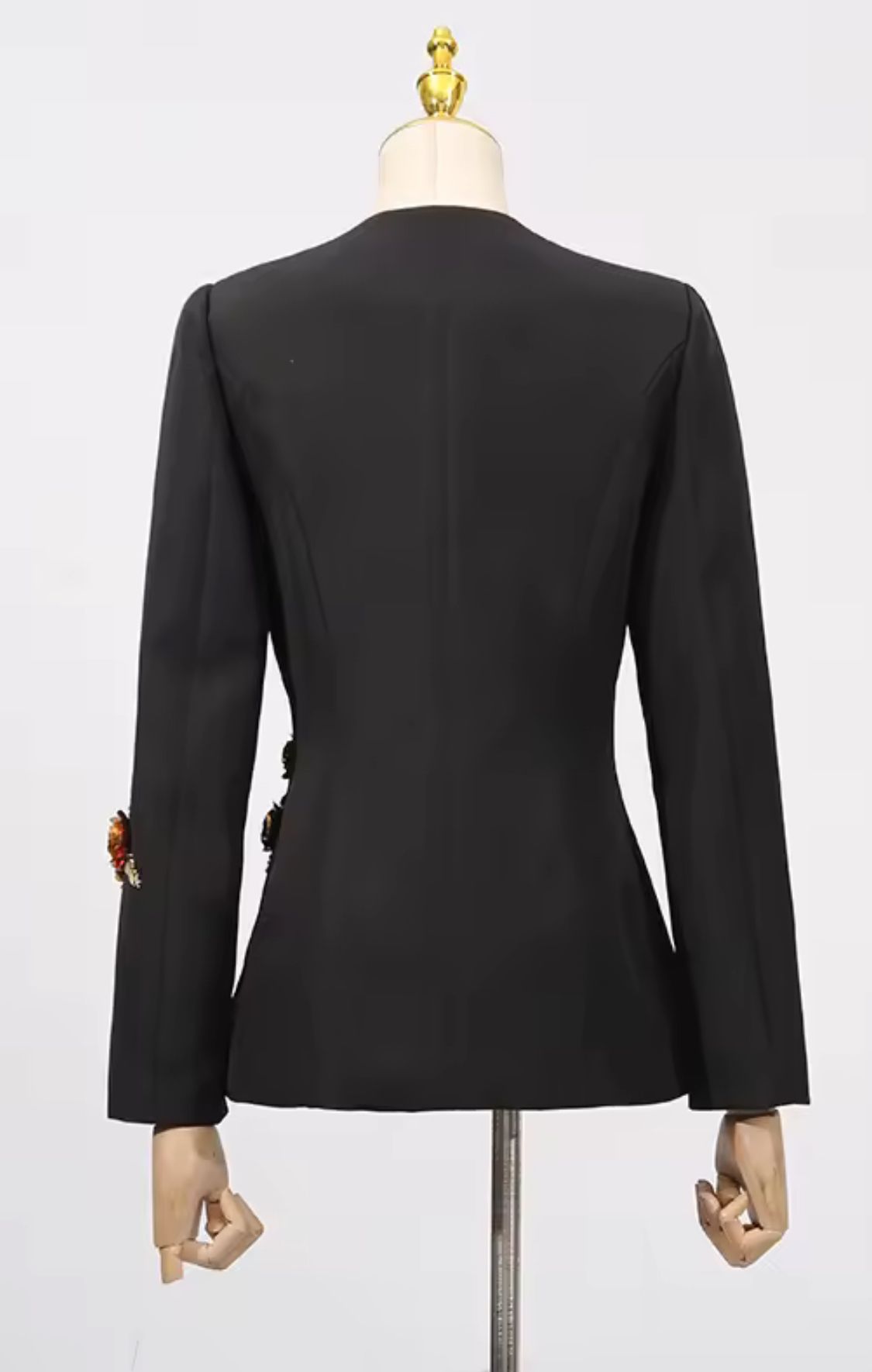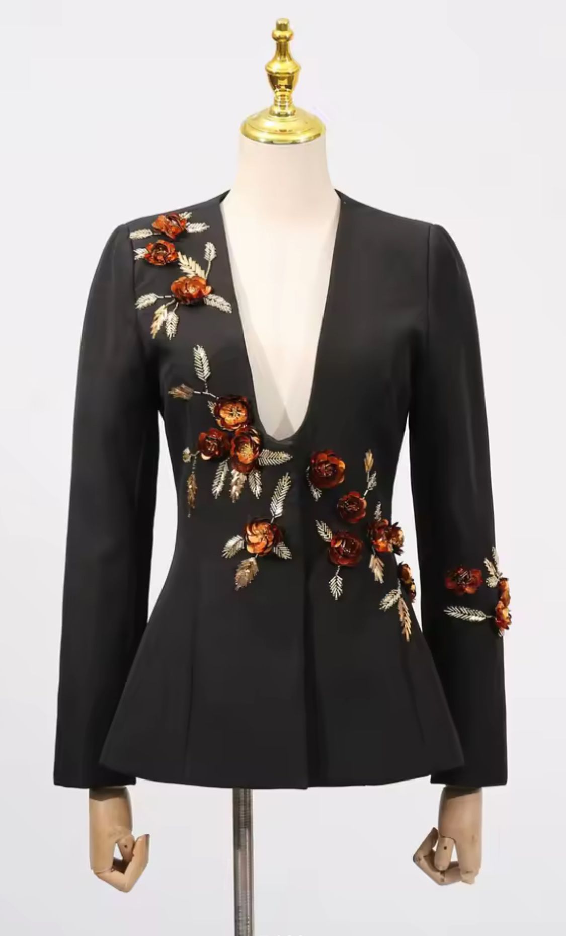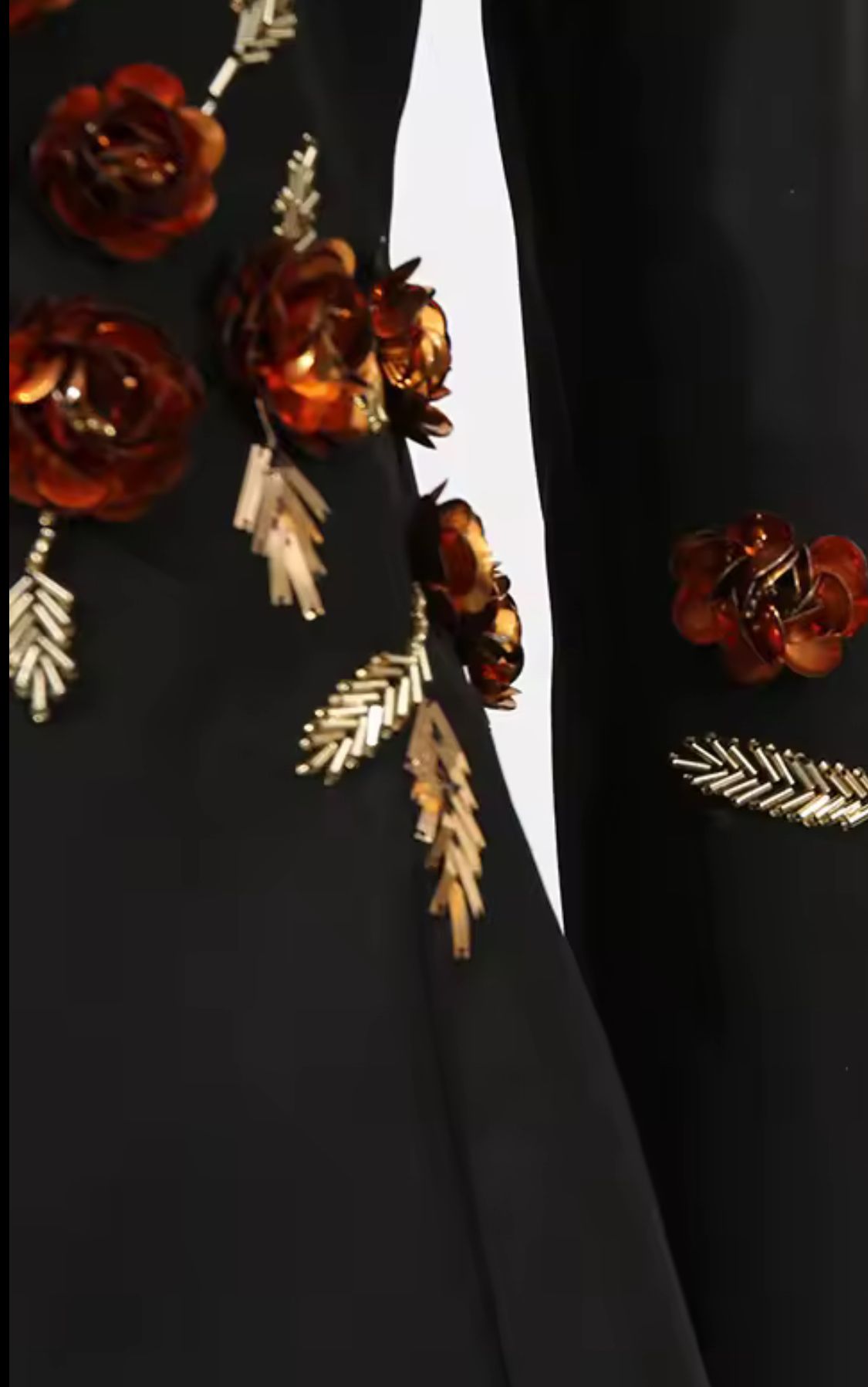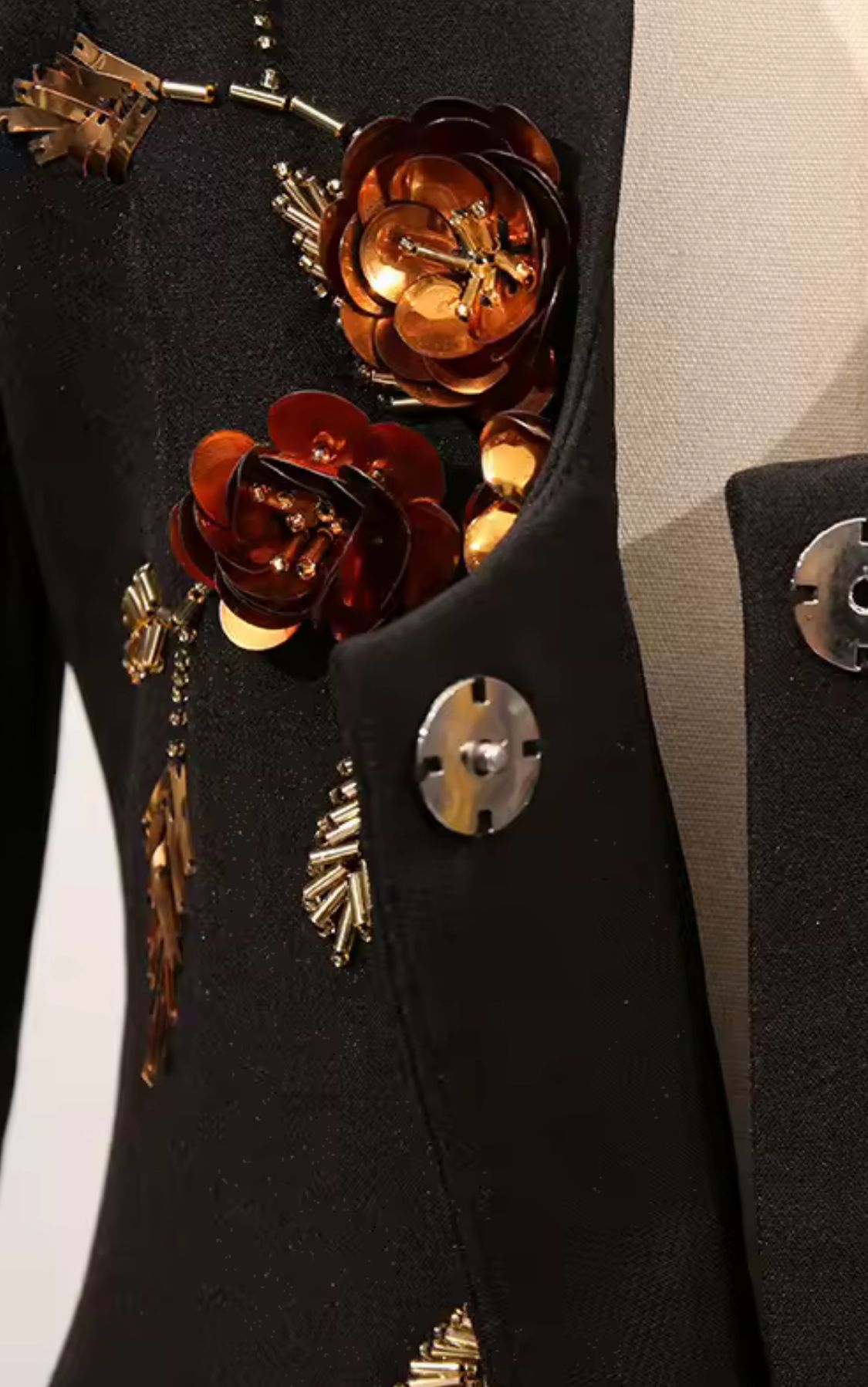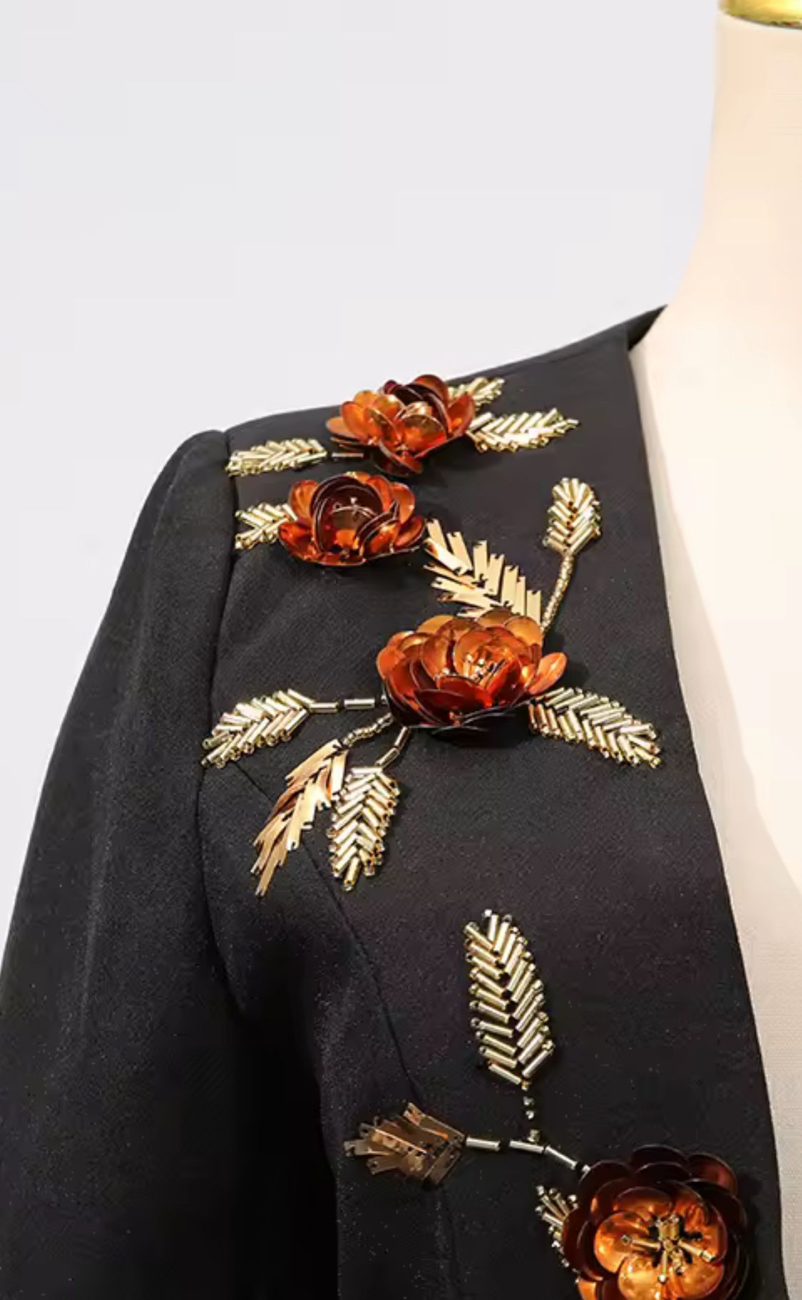 Americana negra entallada con hermosa pedrería en forma de flores y lentejuelas en tonos marrones y dorados