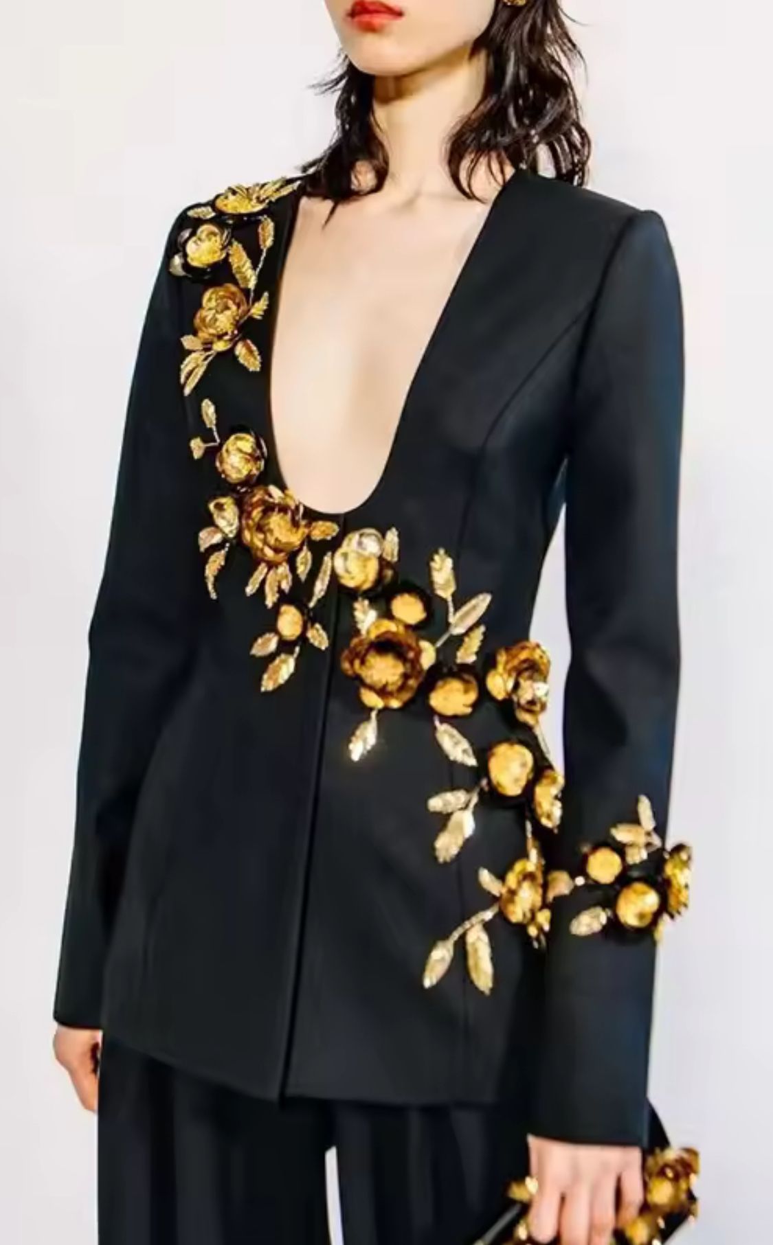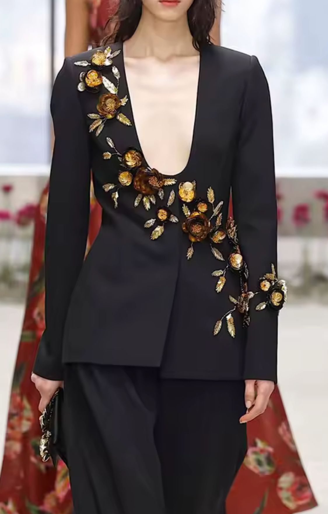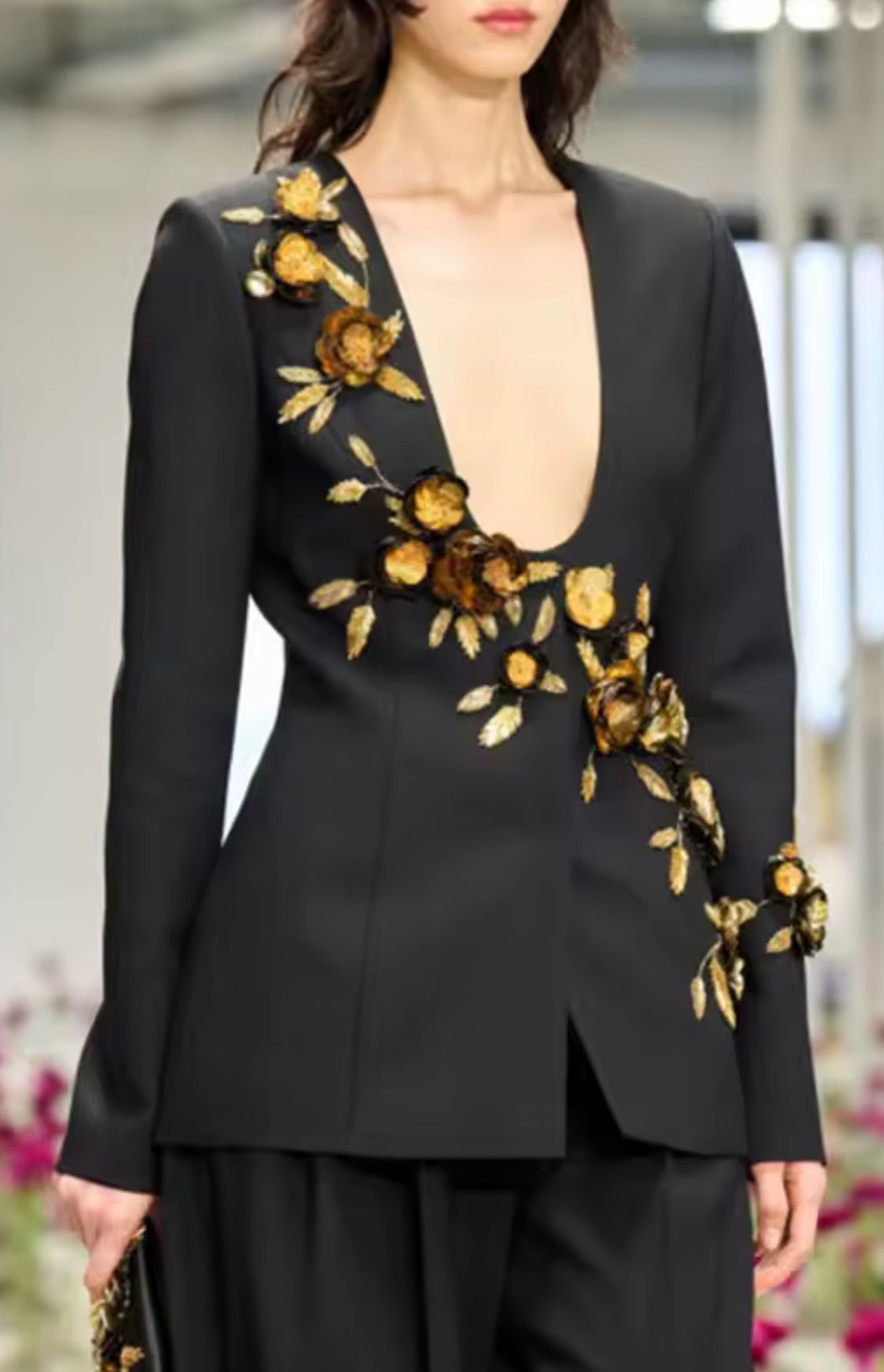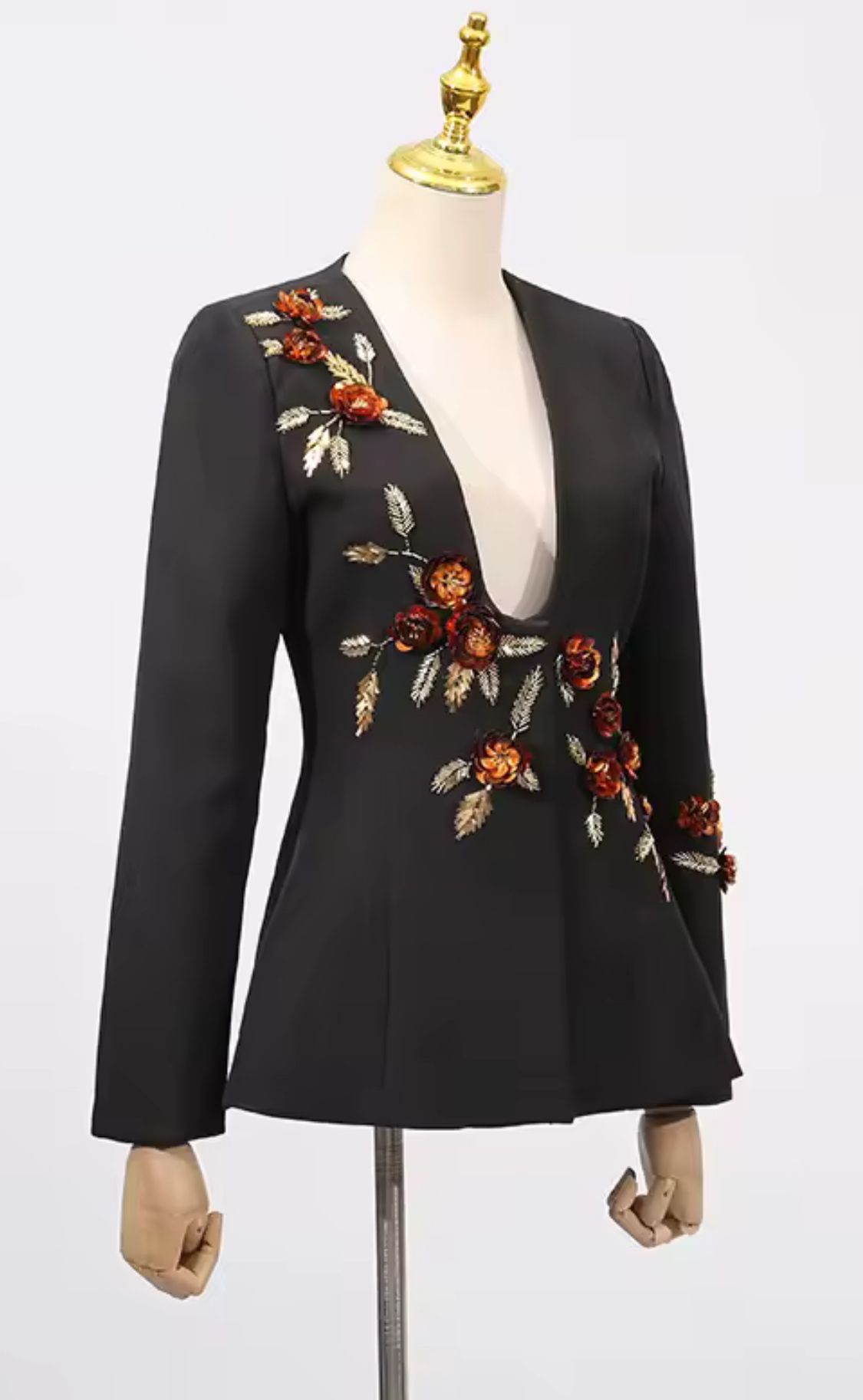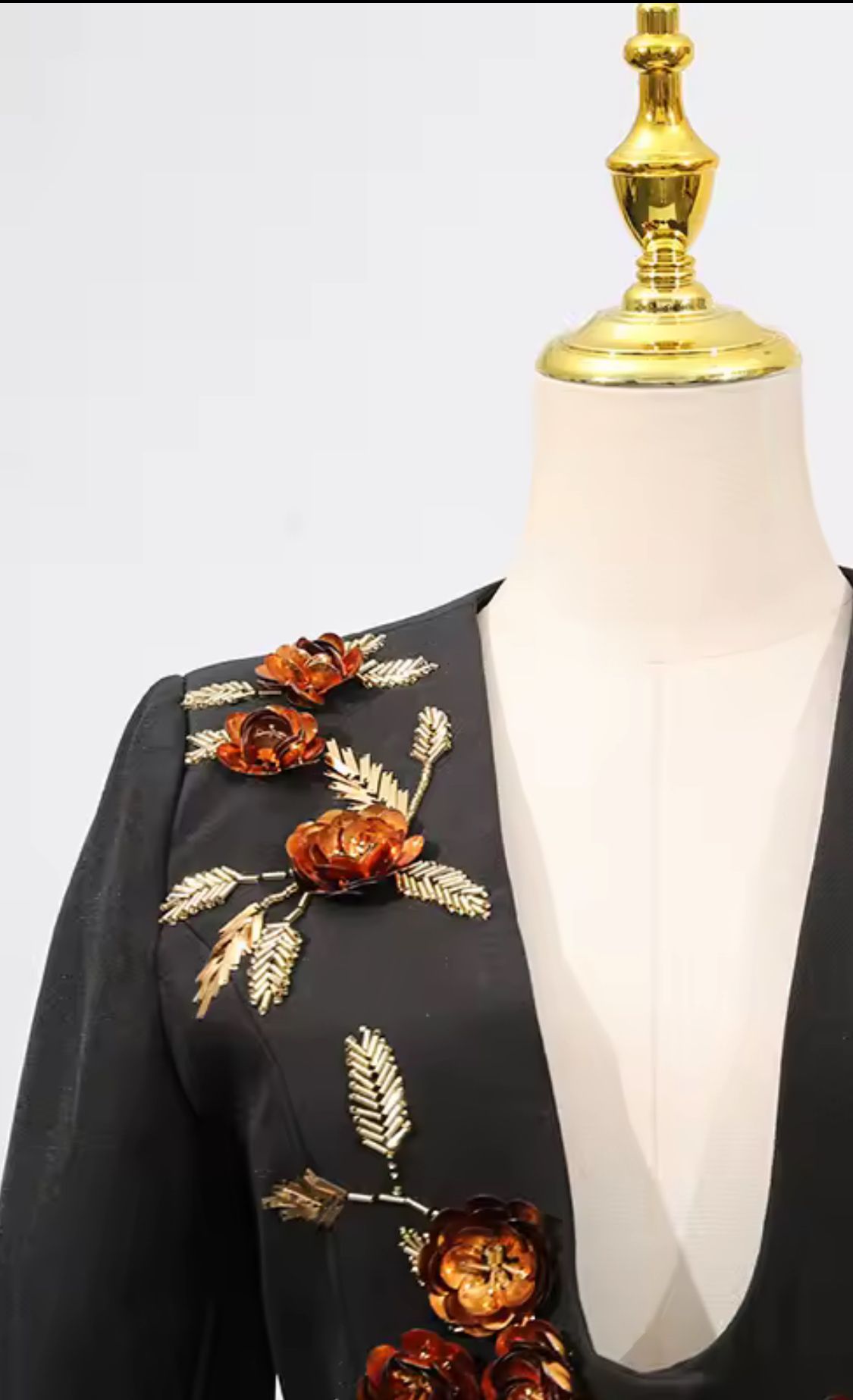 Americana negra entallada con hermosa pedrería en forma de flores y lentejuelas en tonos marrones y dorados