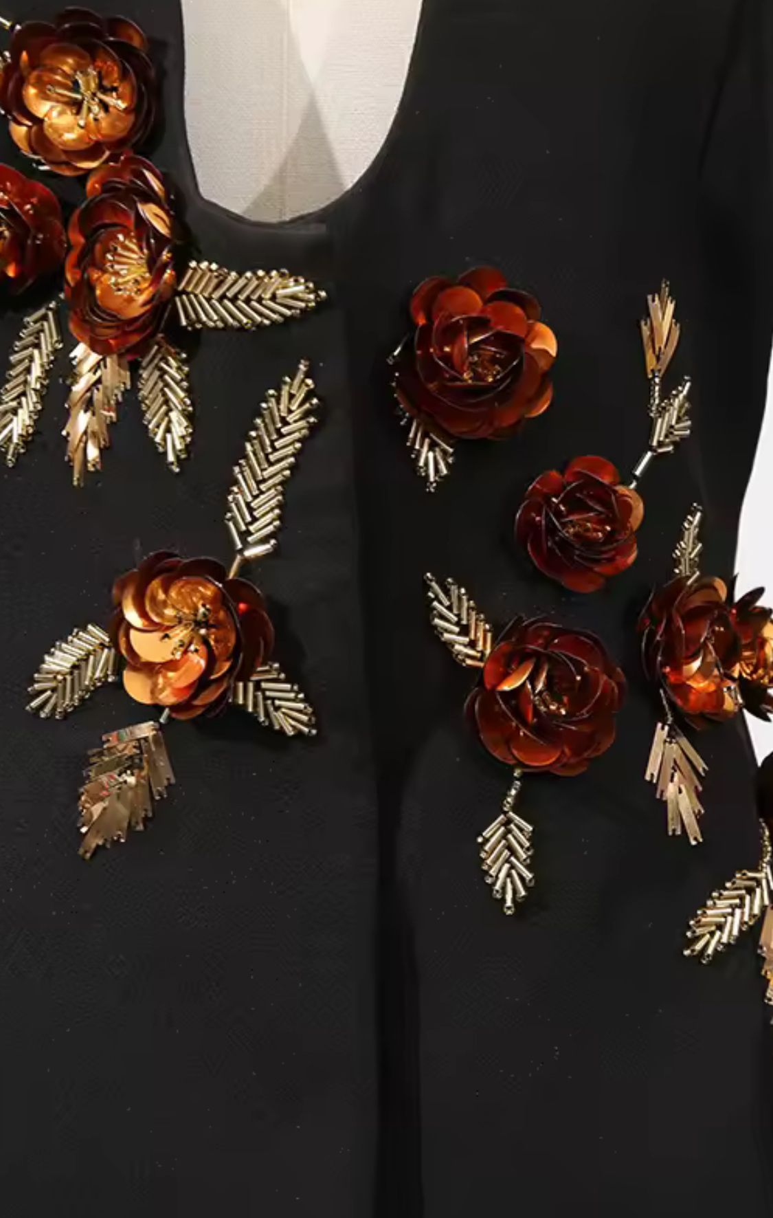 Bordados dorados con flores de lentejuelas en relieve en tonos marrones cobrizos.