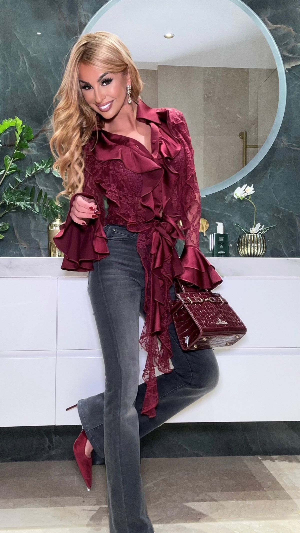 Chemisier en dentelle à manches longues et à volants, en satin brillant bordeaux