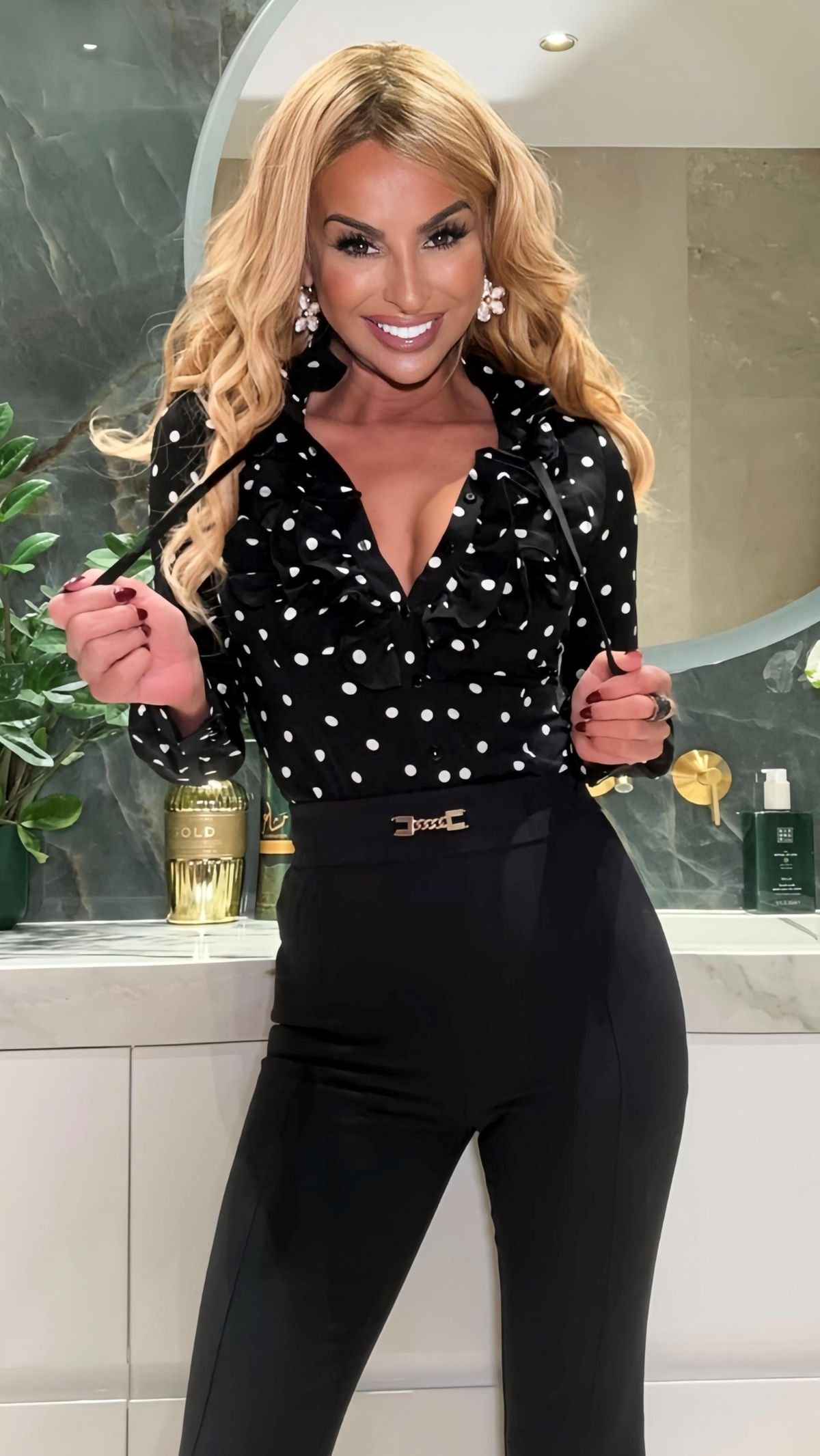 Una blusa fascinante elegante y sofisticada en un clásico estampado de lunares.