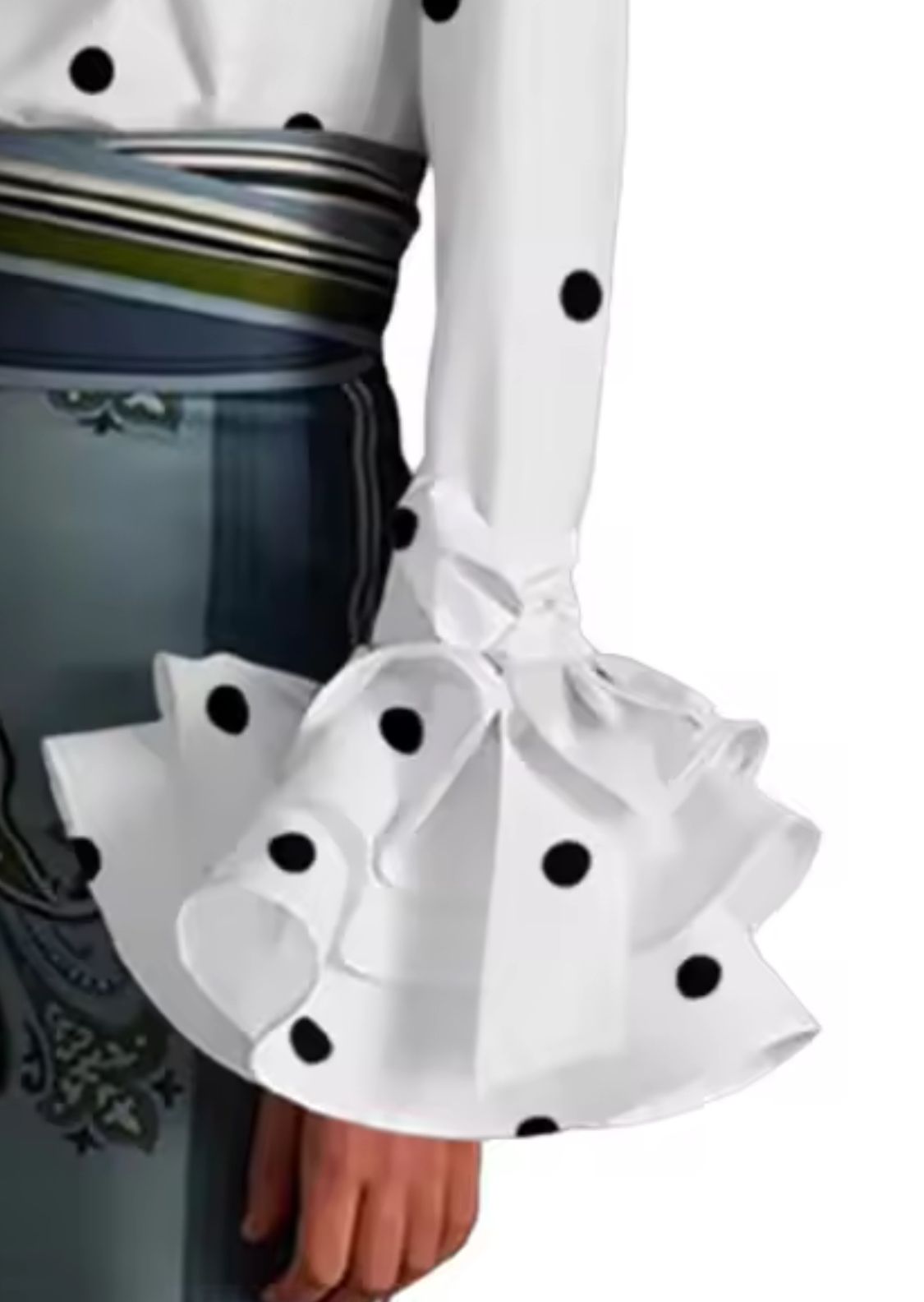 Blusa entallada blanca de lunares negros con espectaculares puños de volantes