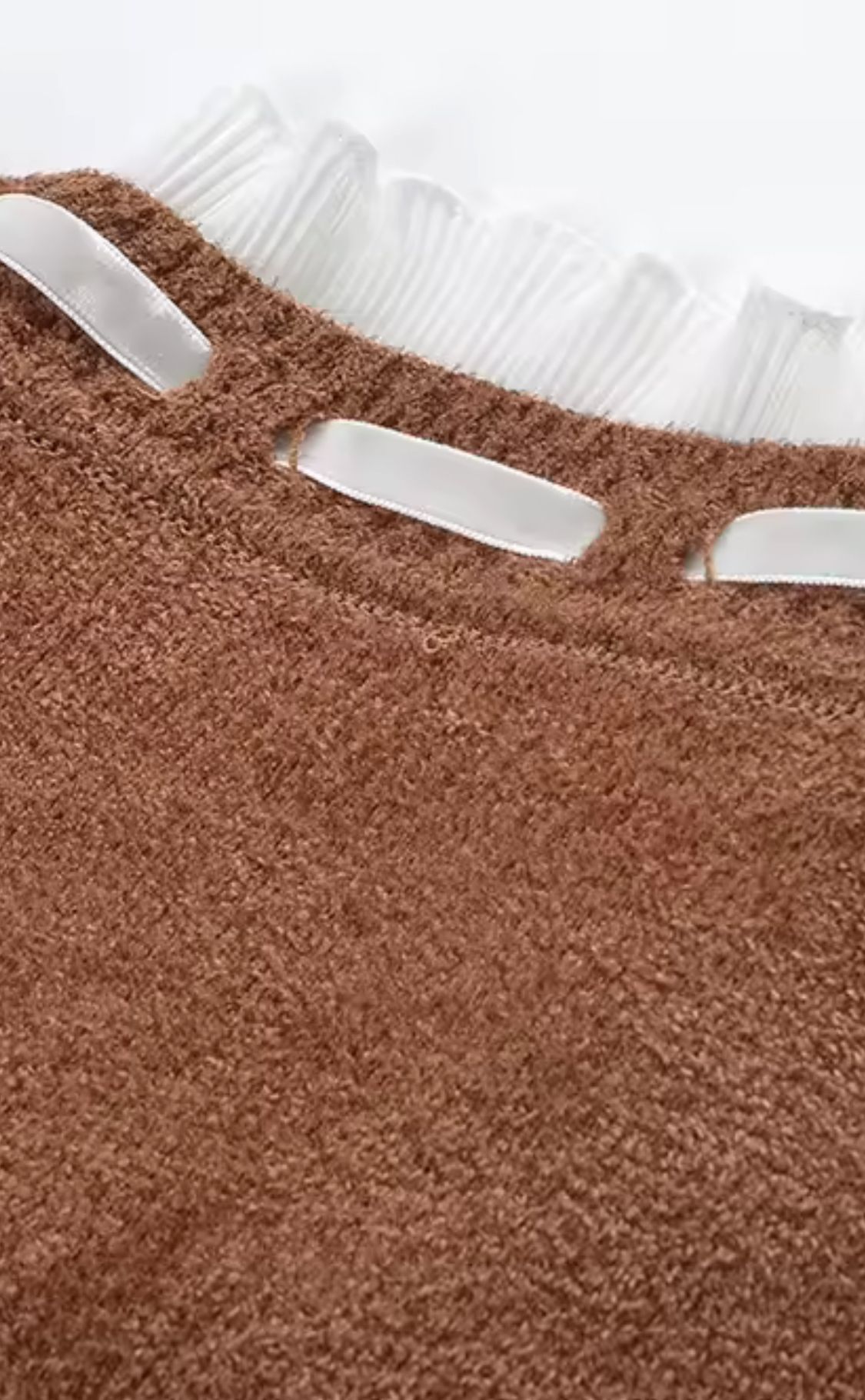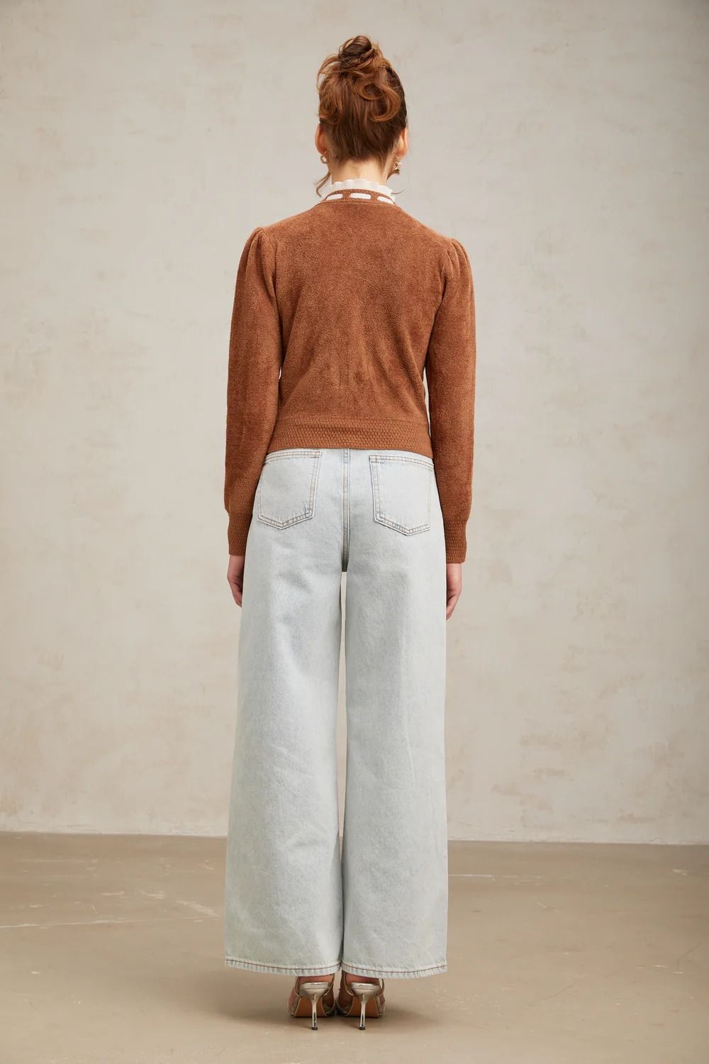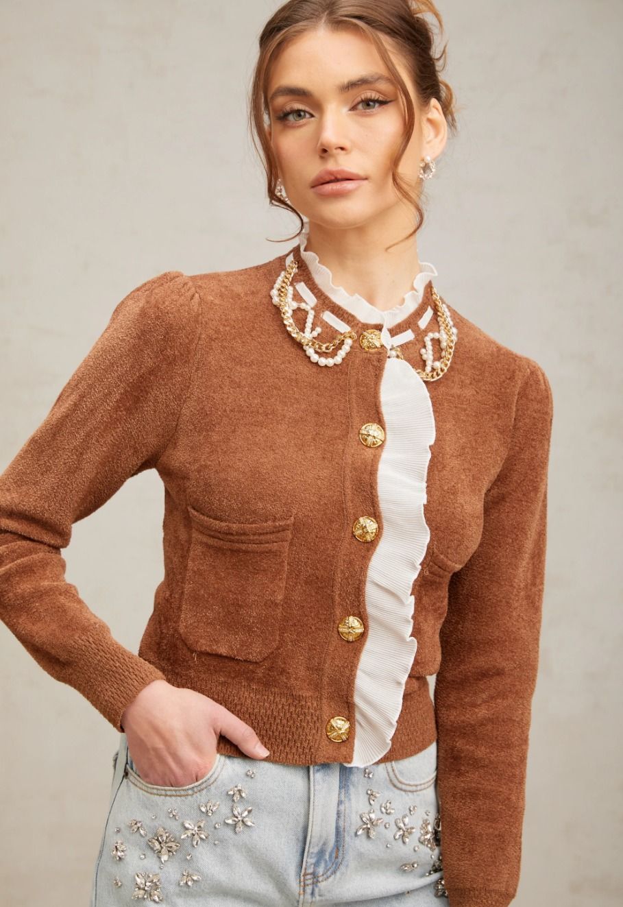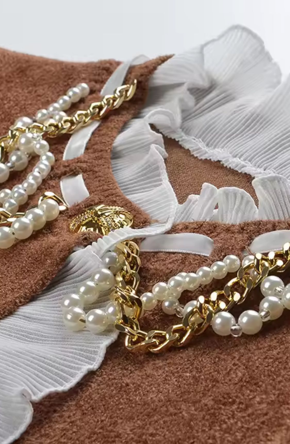 Jersey de punto elástico marrón con cadenas doradas y puntillas decorativas