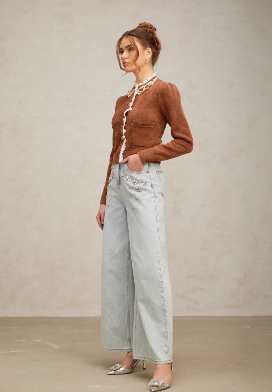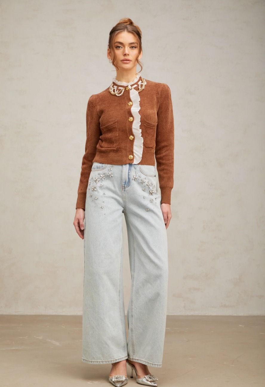 Un delicado y hermoso jersey cárdigan lleno de glamour y con ese toque tan chic que nos caracteriza.