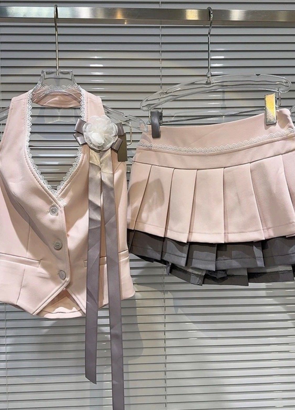 Conjunto de falda y chaleco en rosa palo con detalles en gris