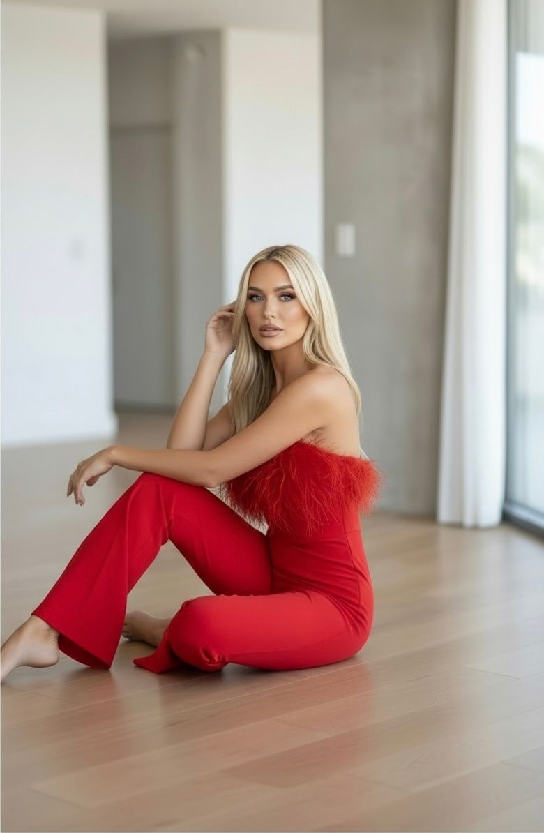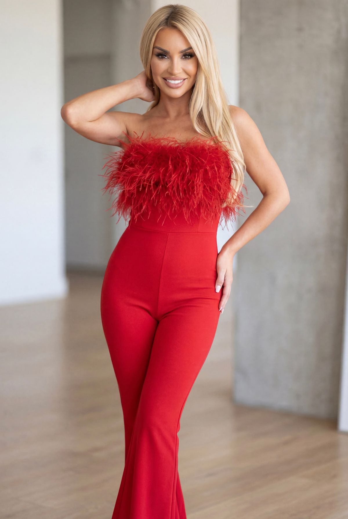Combinaison en tissu bandage élastique avec décolleté bustier avec plumes et pantalon long en rouge bordeaux