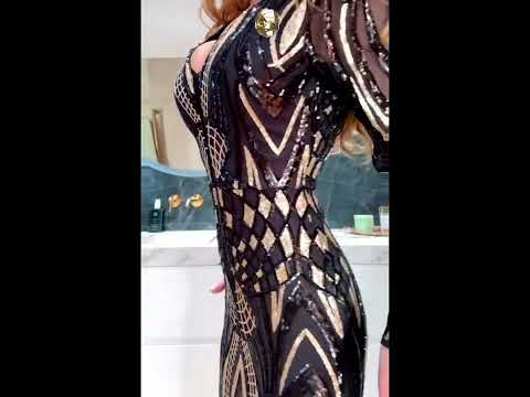 Robe longue de bal de fin d'année extensible à manches longues et à paillettes noir et doré