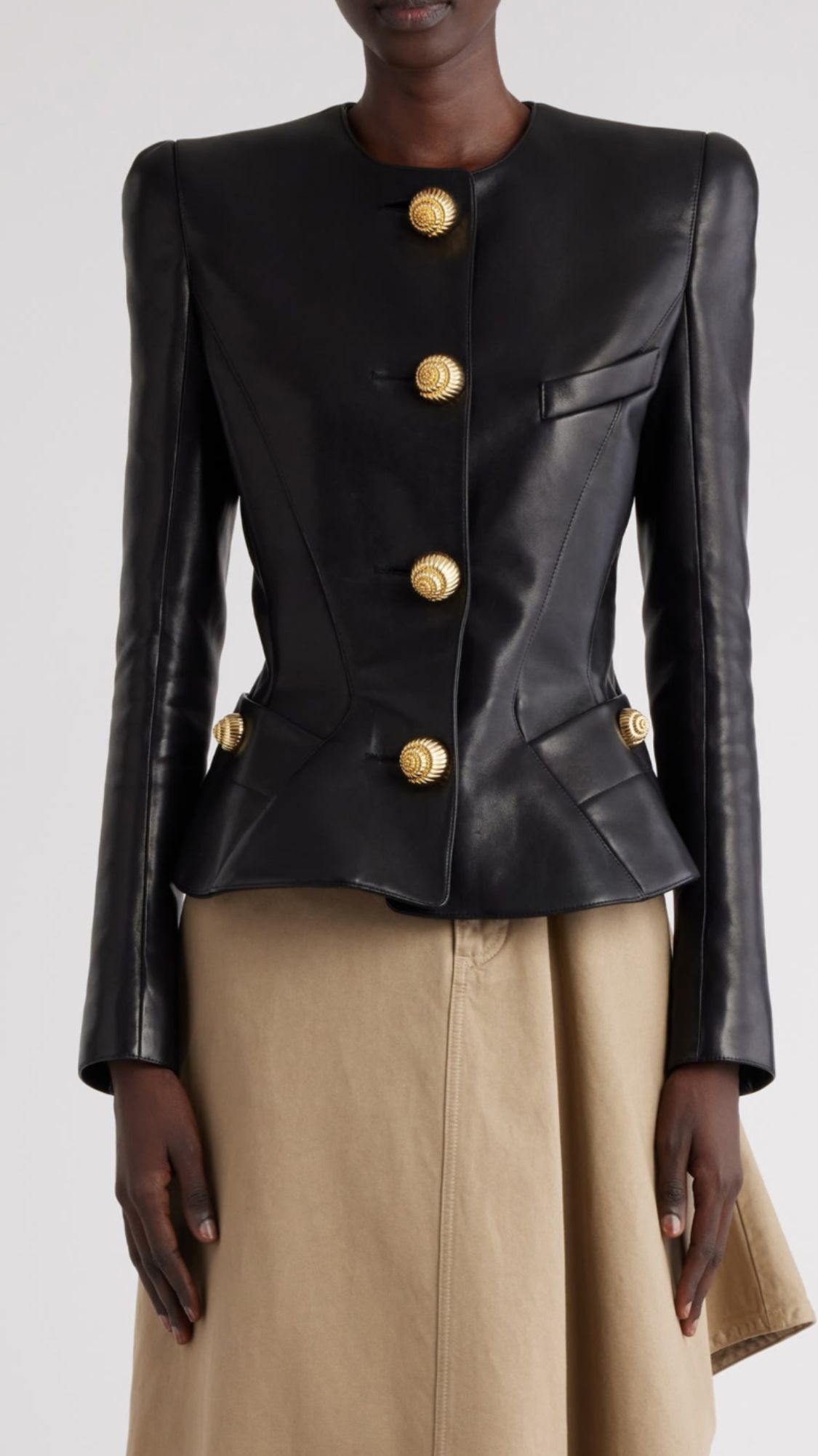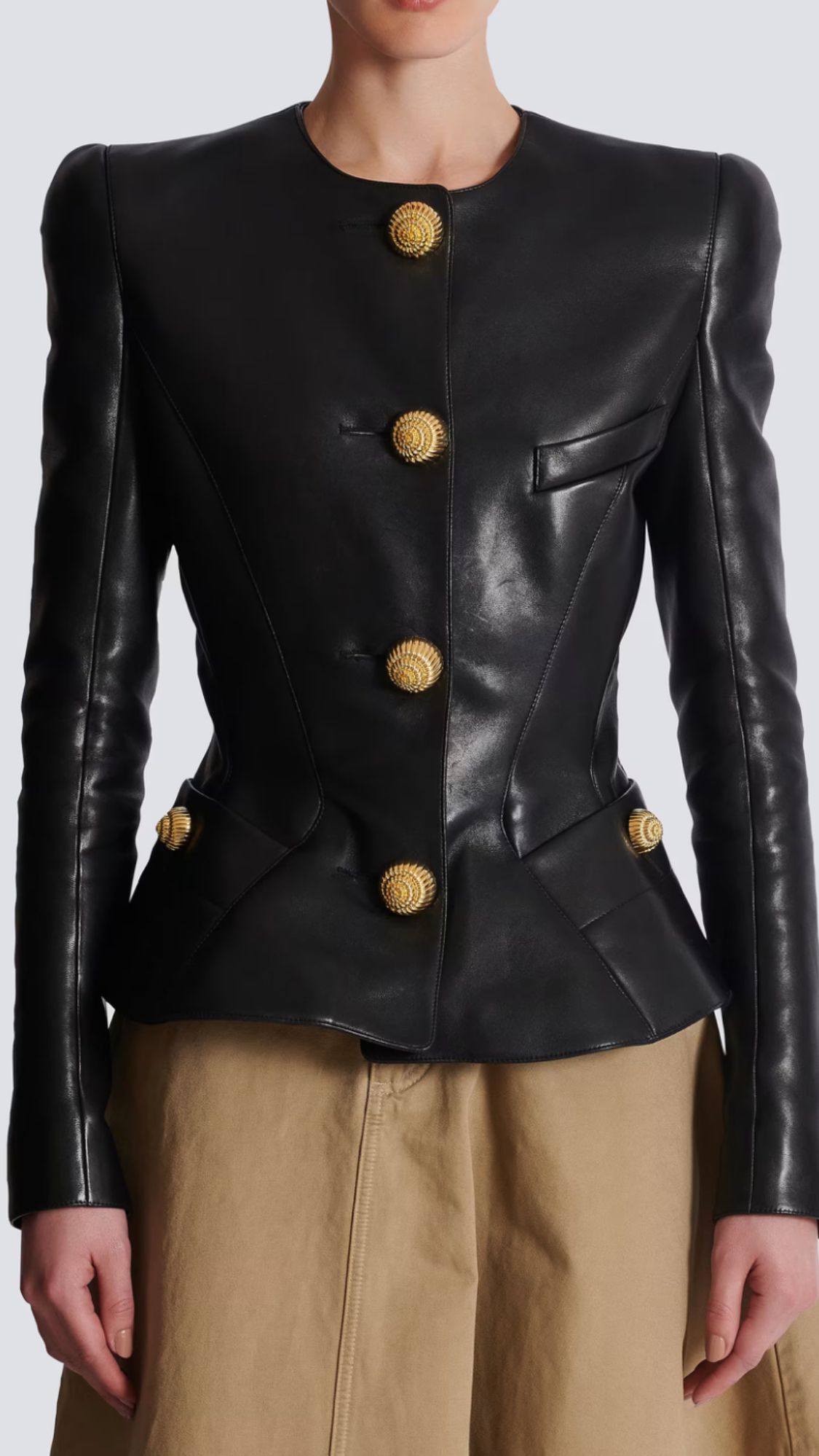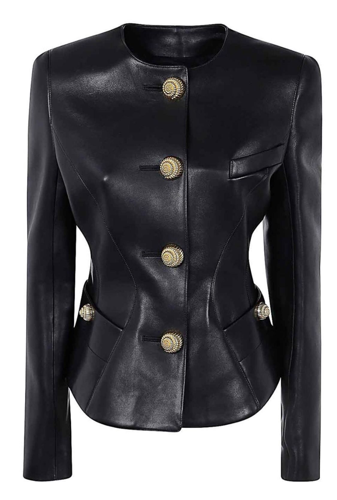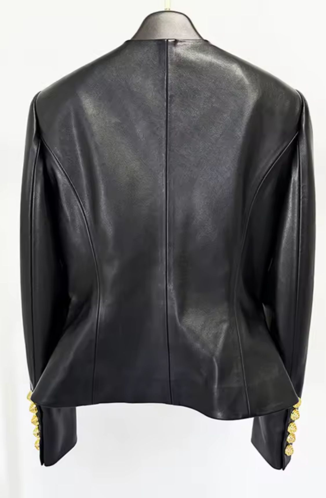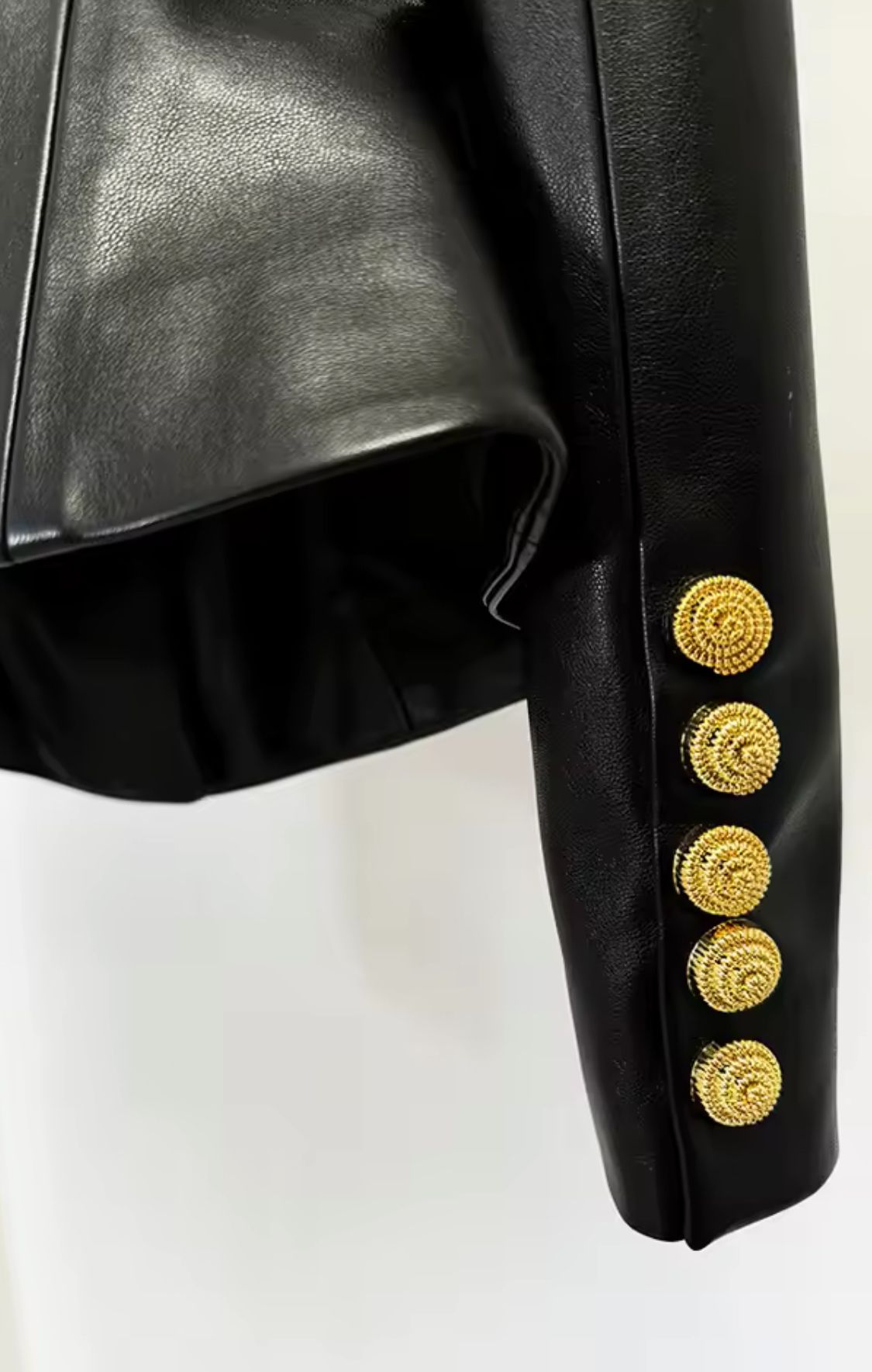 Un blazer noir spectaculaire en similicuir orné de magnifiques boutons métalliques dorés en forme de coquillage.