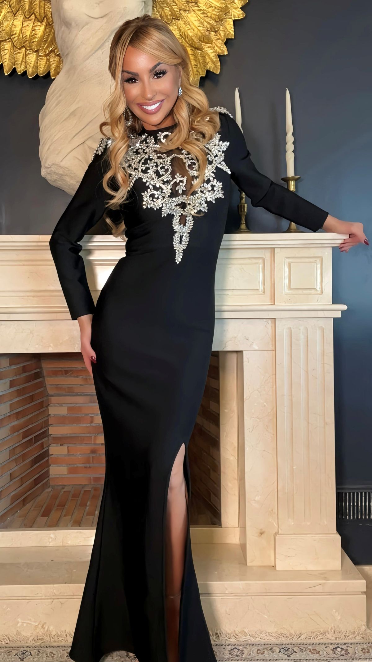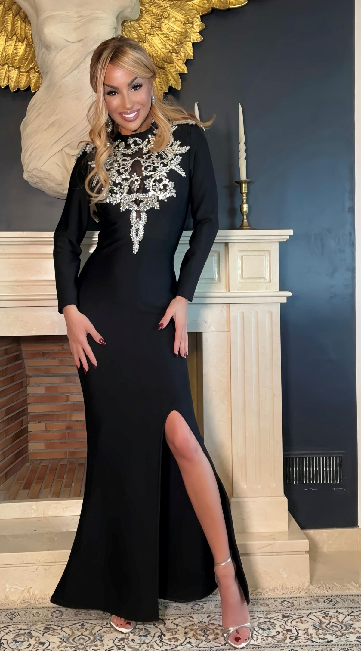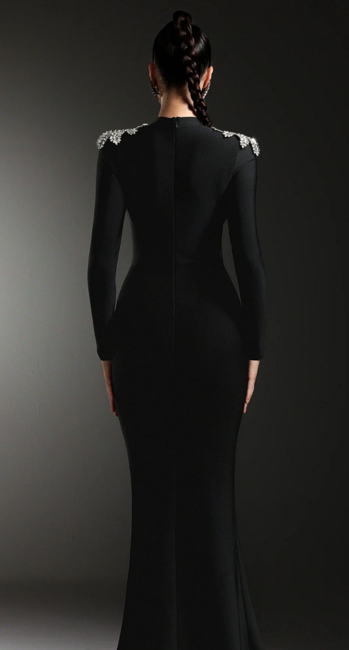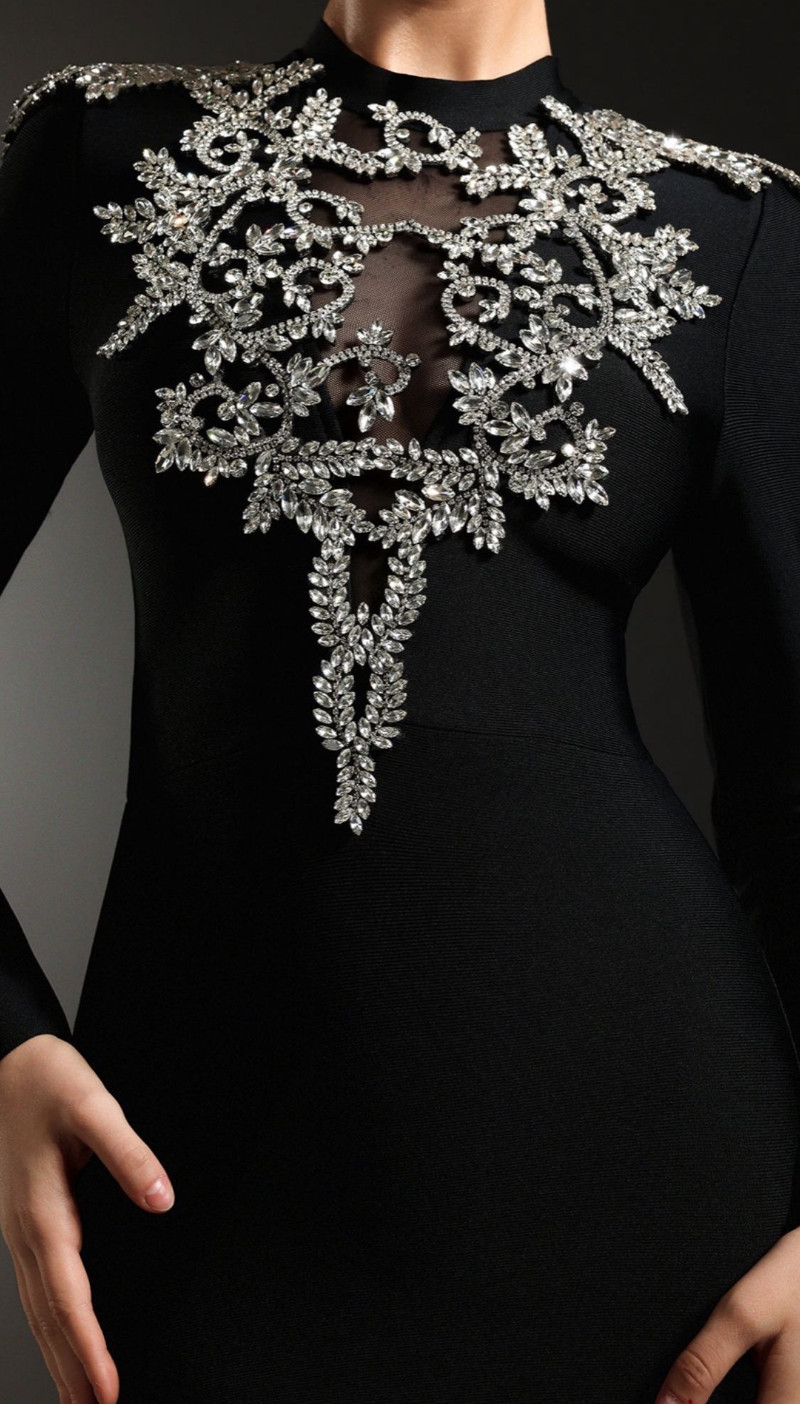 Robe bandage élastique à manches longues avec strass argentés à l'encolure