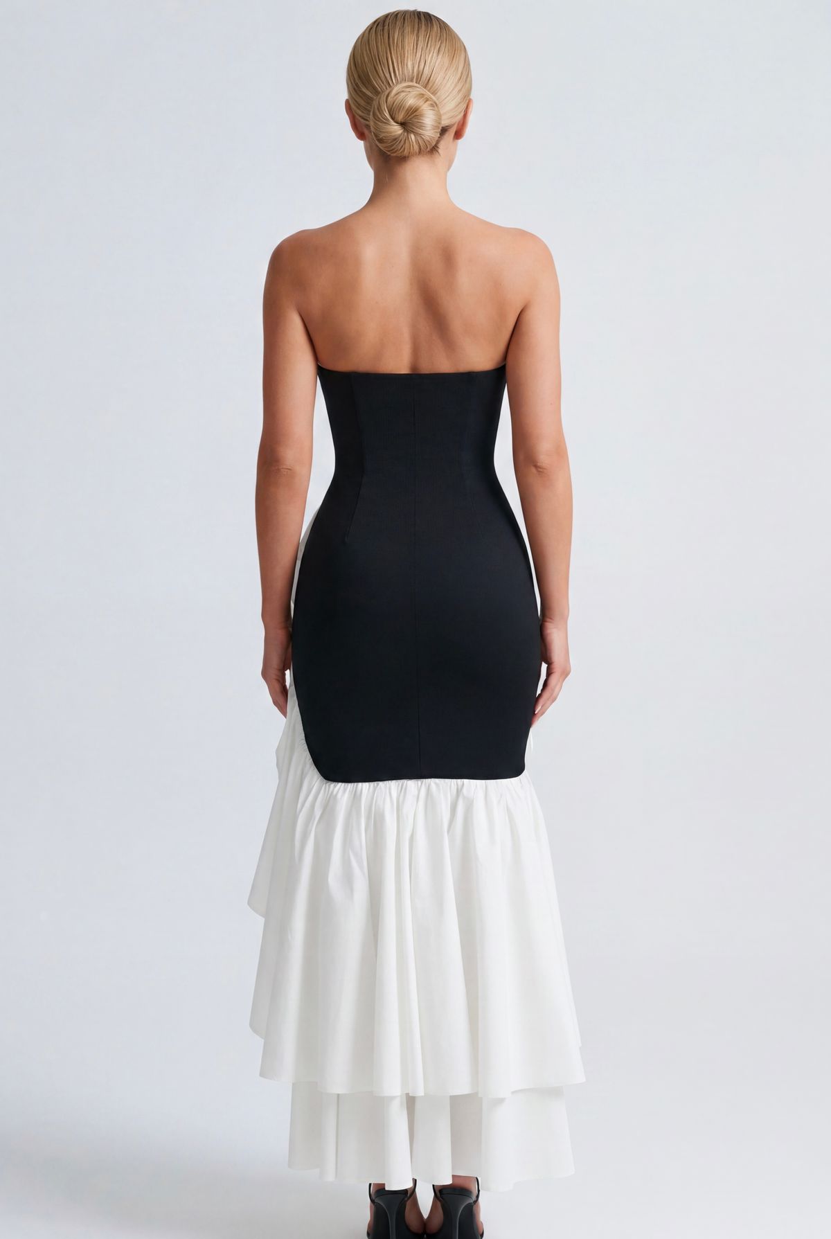 Robe longue noire en tissu stretch bandage, bustier sans bretelles, fente latérale ornée d'un volant blanc en satin brillant.