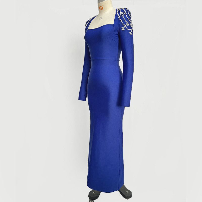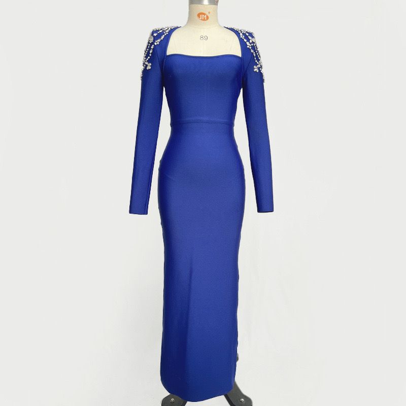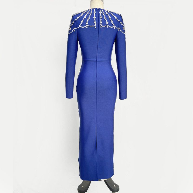 Robe bandage longue et extensible à manches longues et strass bleus