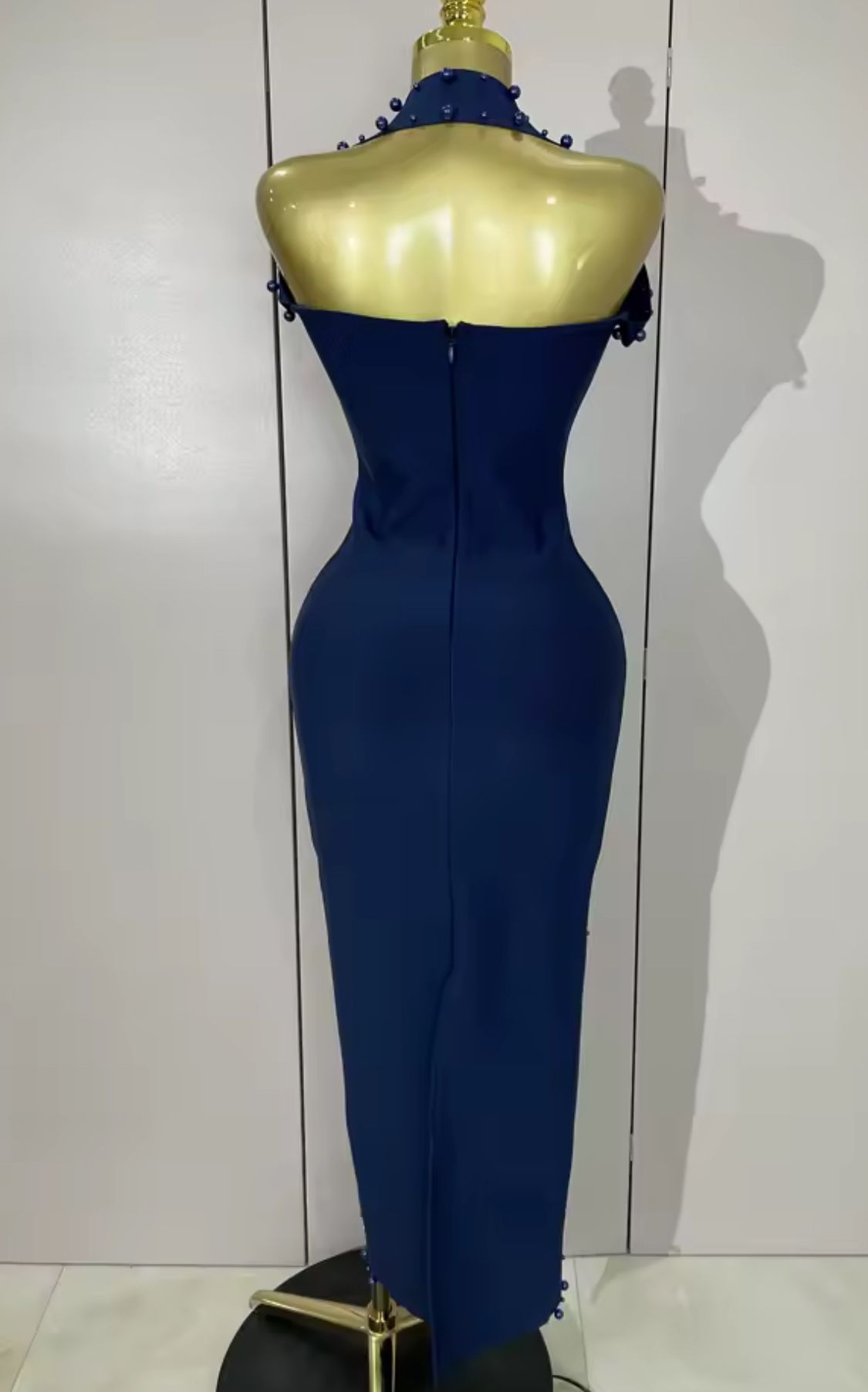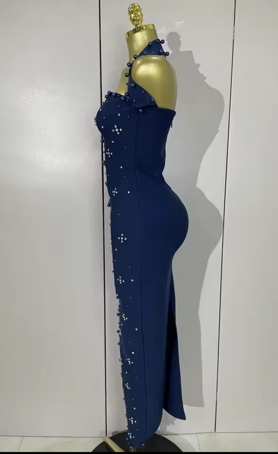 Robe longue moulante bleu marine à strass argentés