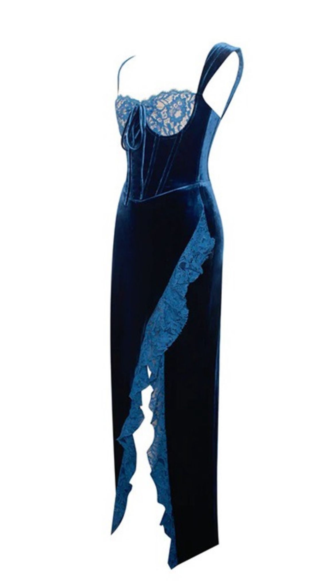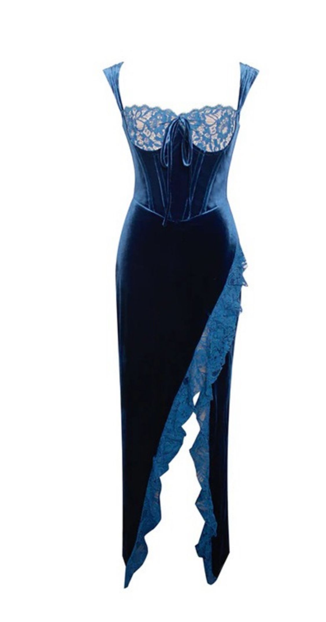 Robe longue en velours stretch bleu électrique avec fente latérale et bordure en dentelle