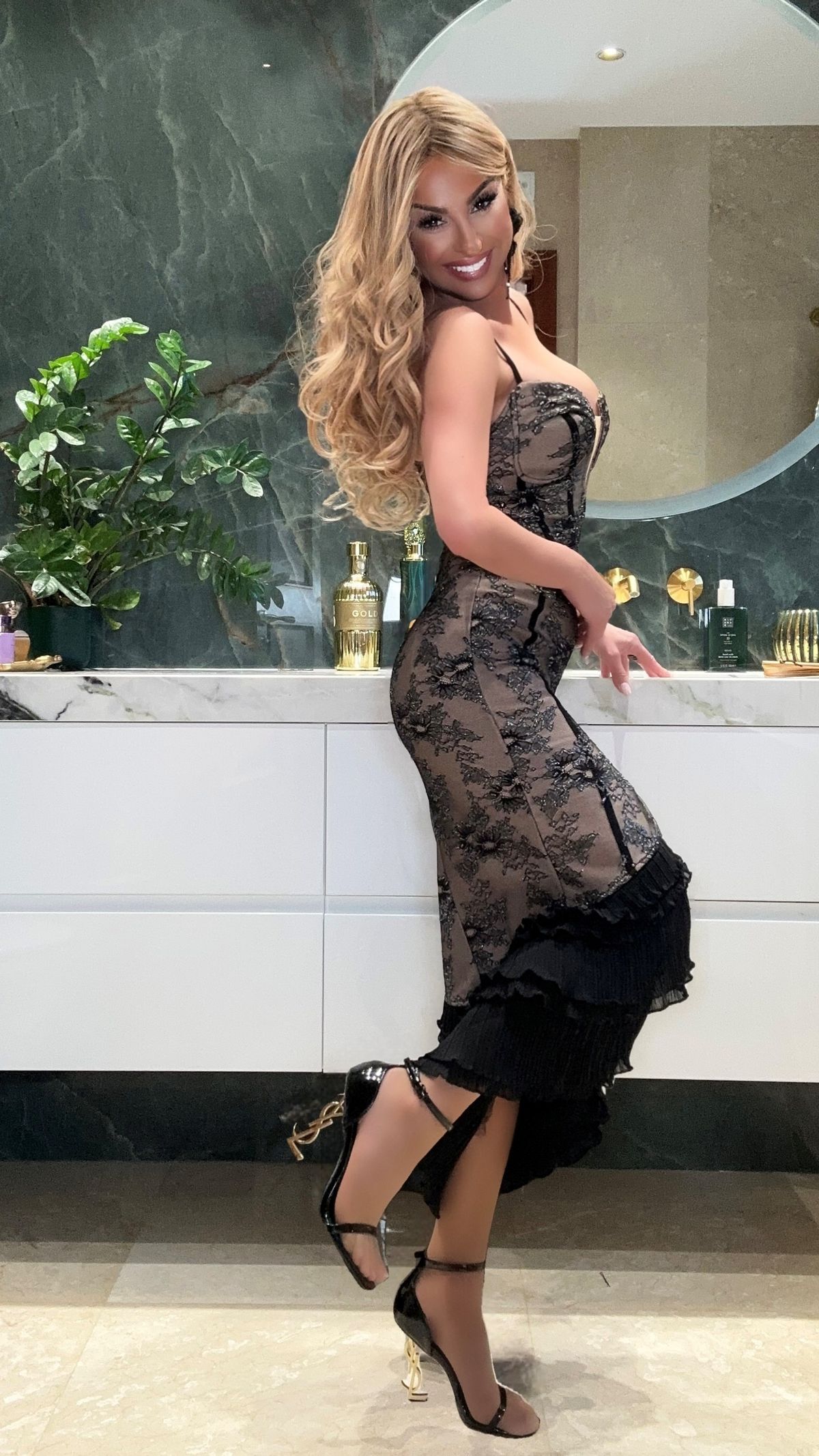 Notre élégante robe Palm Beach est absolument magnifique. C'est une robe extrêmement sophistiquée et glamour. Cette robe bandage noire extensible de haute qualité affine et sculpte la silhouette. Elle se distingue par son design et sa qualité. Avec sa longueur midi et sa fente sur le devant, elle est idéale pour les célébrations qui requièrent une élégance discrète, comme les baptêmes ou les communions. La dentelle est un symbole d'élégance intemporel qui ne se démode jamais. Doublure couleur chair. Fermeture éclair invisible au dos. Bretelles réglables. De jolis volants plissés ornent la fente sur le devant, un détail remarquable. Le buste est doté d'armatures et d'un rembourrage push-up, vous n'aurez donc pas besoin de porter de soutien-gorge. Le mannequin porte une taille S et mesure 174 cm. MESURES : TAILLE XS : 78 cm de tour de poitrine, 64 cm de tour de taille, 87 cm de tour de hanches et 127 cm de longueur. TAILLE S : 82 cm de tour de poitrine, 68 cm de tour de taille, 91 cm de tour de hanches et 127 cm de longueur. TAILLE M : 86 cm de tour de poitrine, 72 cm de tour de taille, 95 cm de tour de hanches et 127 cm de longueur. TAILLE L : 90 cm de tour de poitrine, 76 cm de tour de taille et 99 cm de tour de hanches. Pour plus d'informations, contactez-nous via WhatsApp : 623 449 119