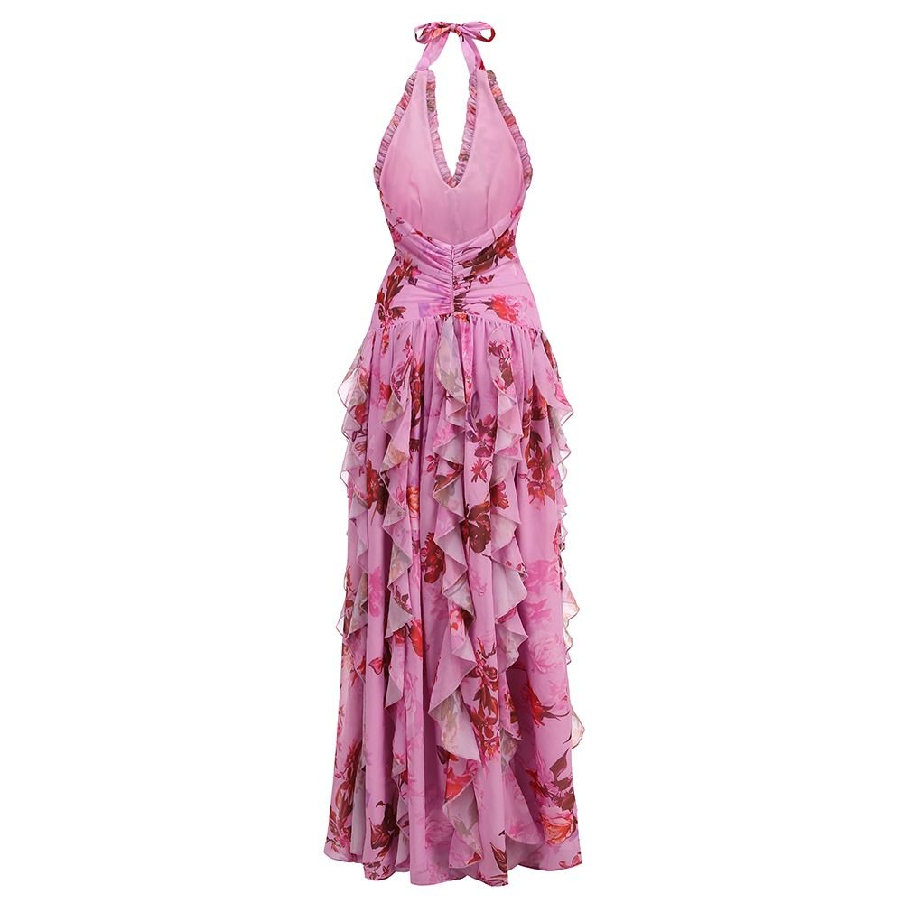 Robe longue légèrement extensible à imprimé floral avec volants dans des tons roses vibrants