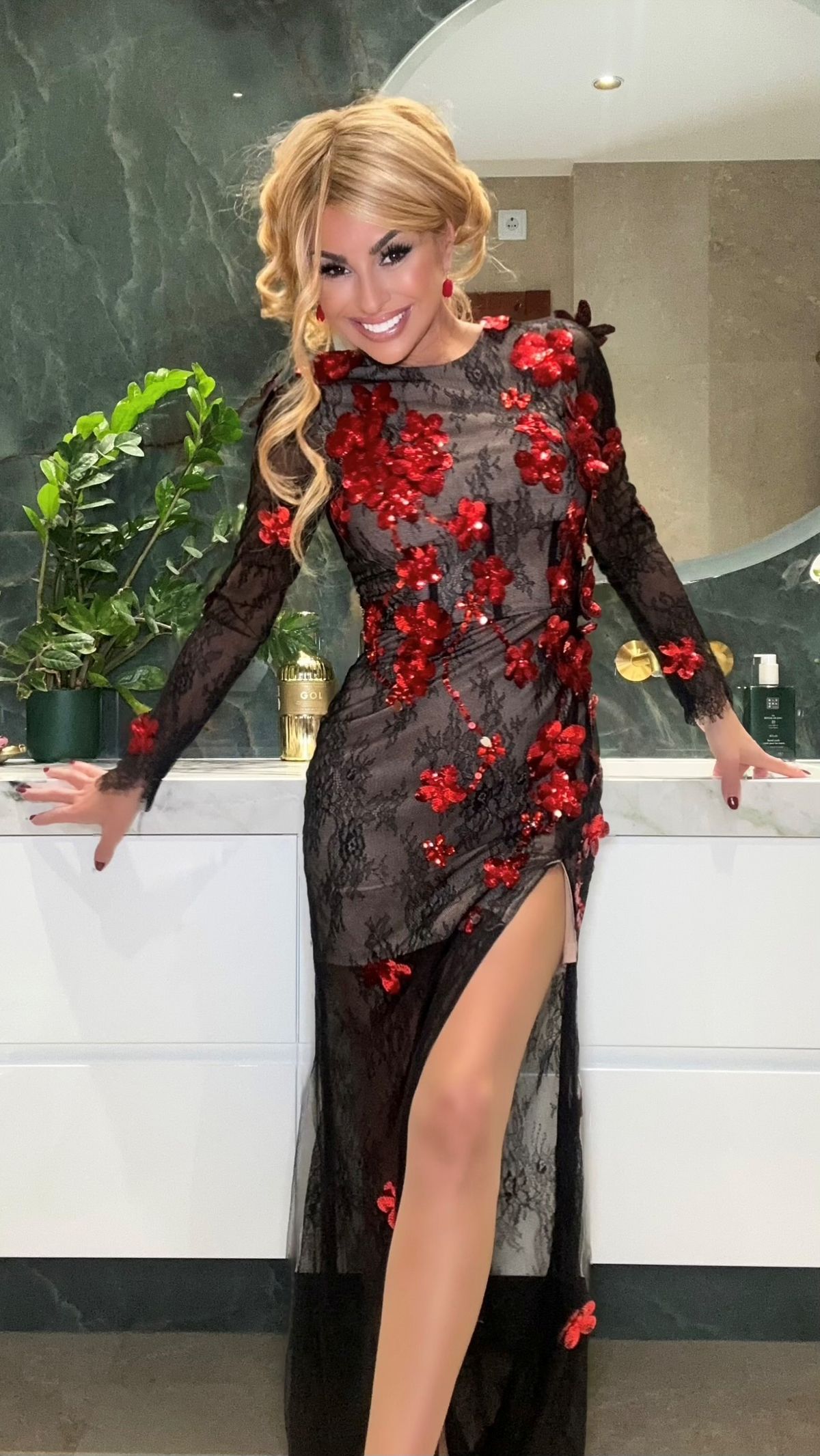 Robe longue noire en dentelle extensible avec jambes fendues sur le côté et fleurs rouges à paillettes en relief en 3D