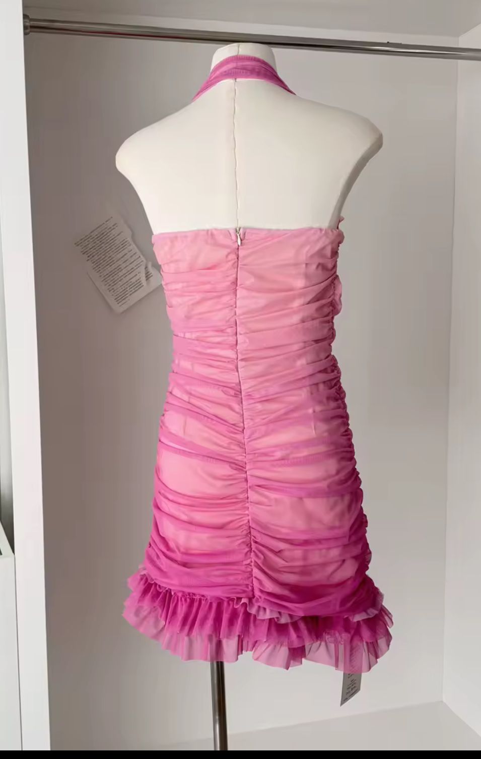 Une magnifique robe courte extensible à fronces, ornée d'un superbe dégradé de rose.