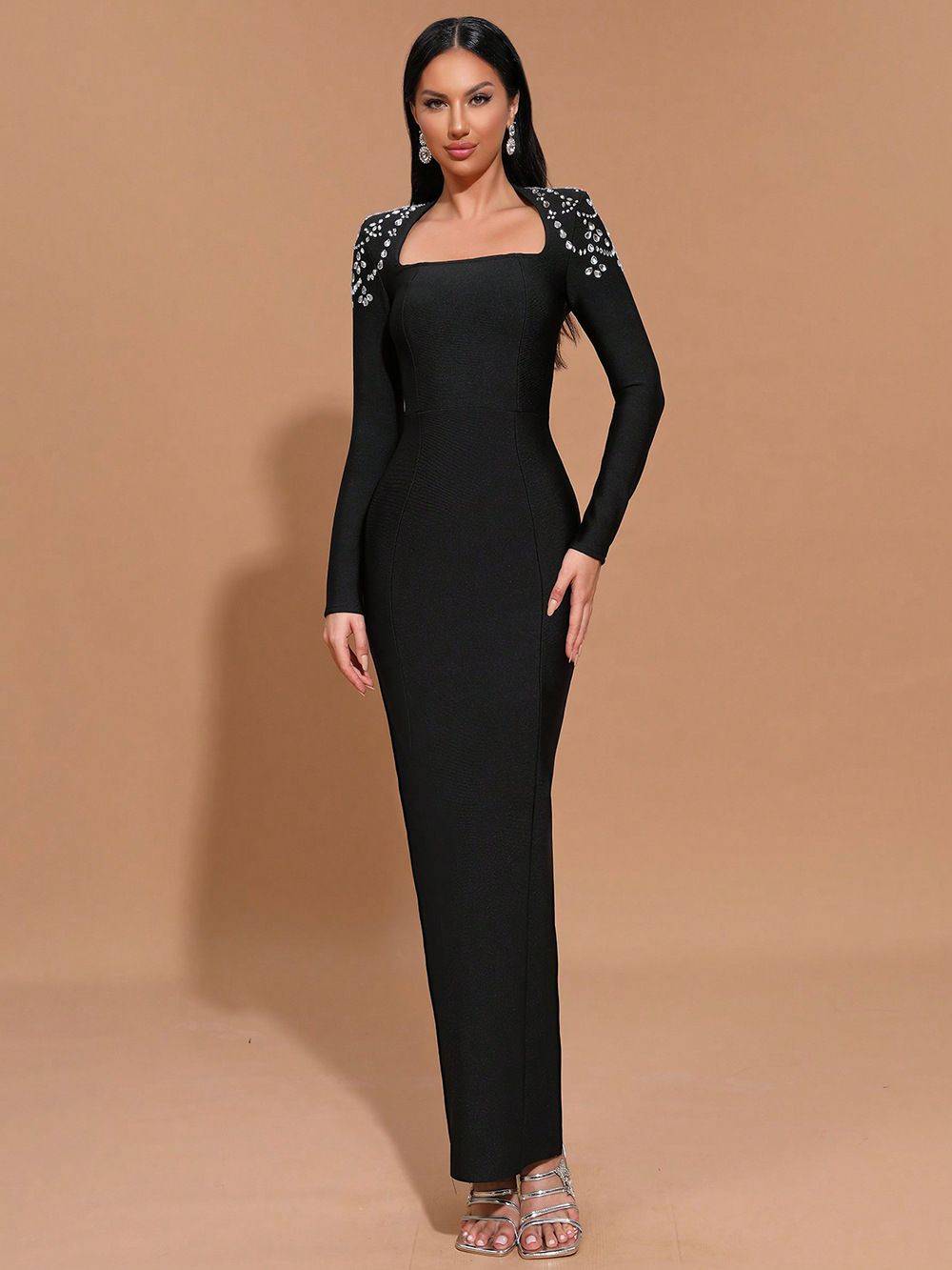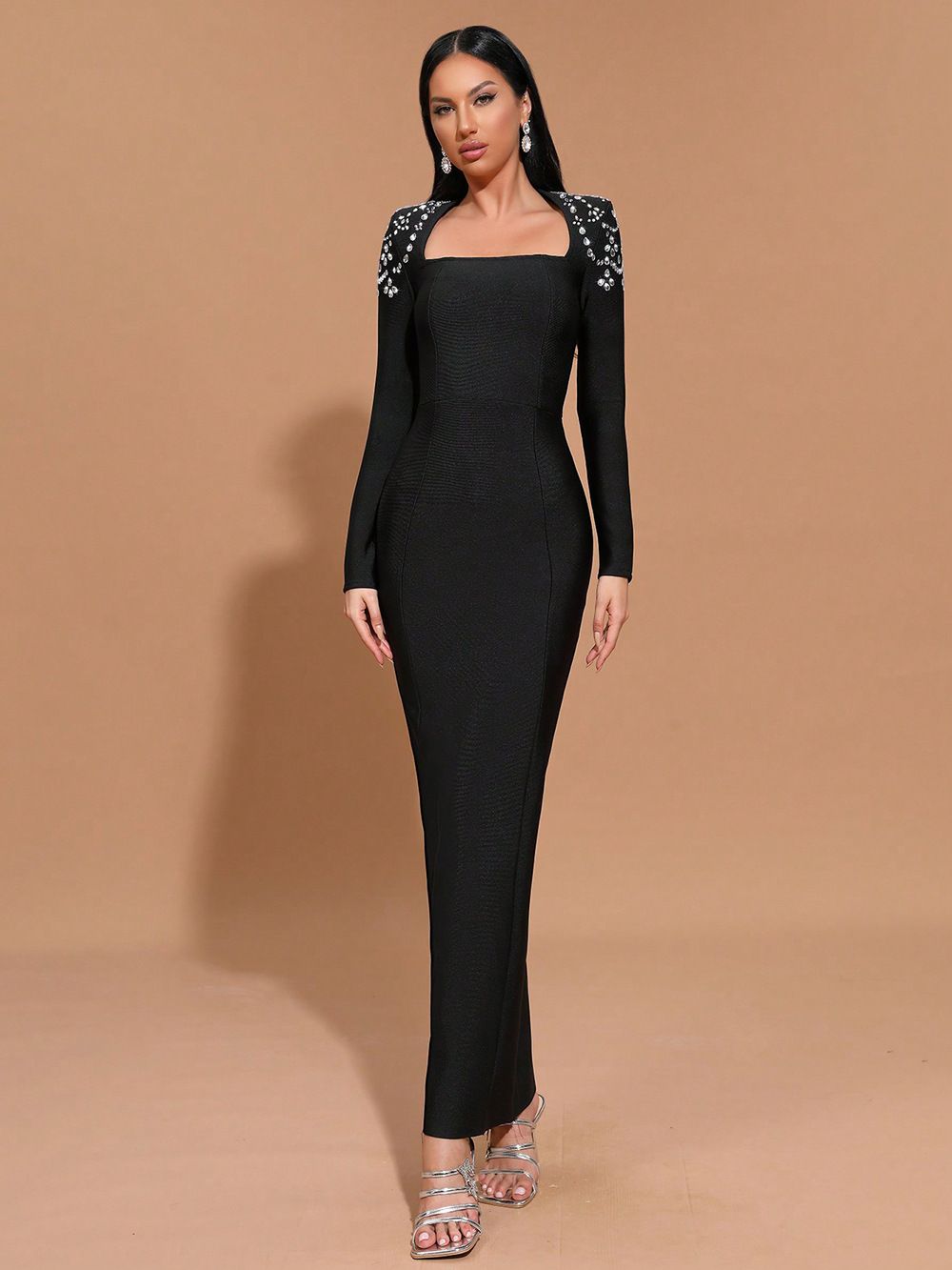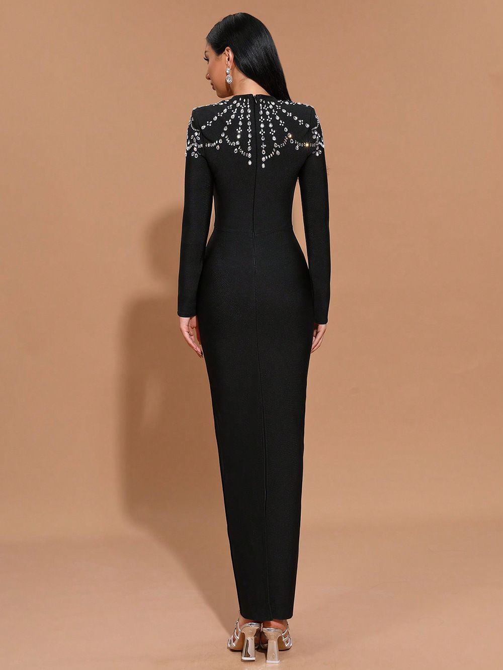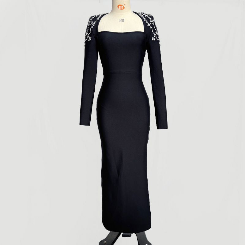 Robe bandage élastique à manches longues ornée de strass noirs
