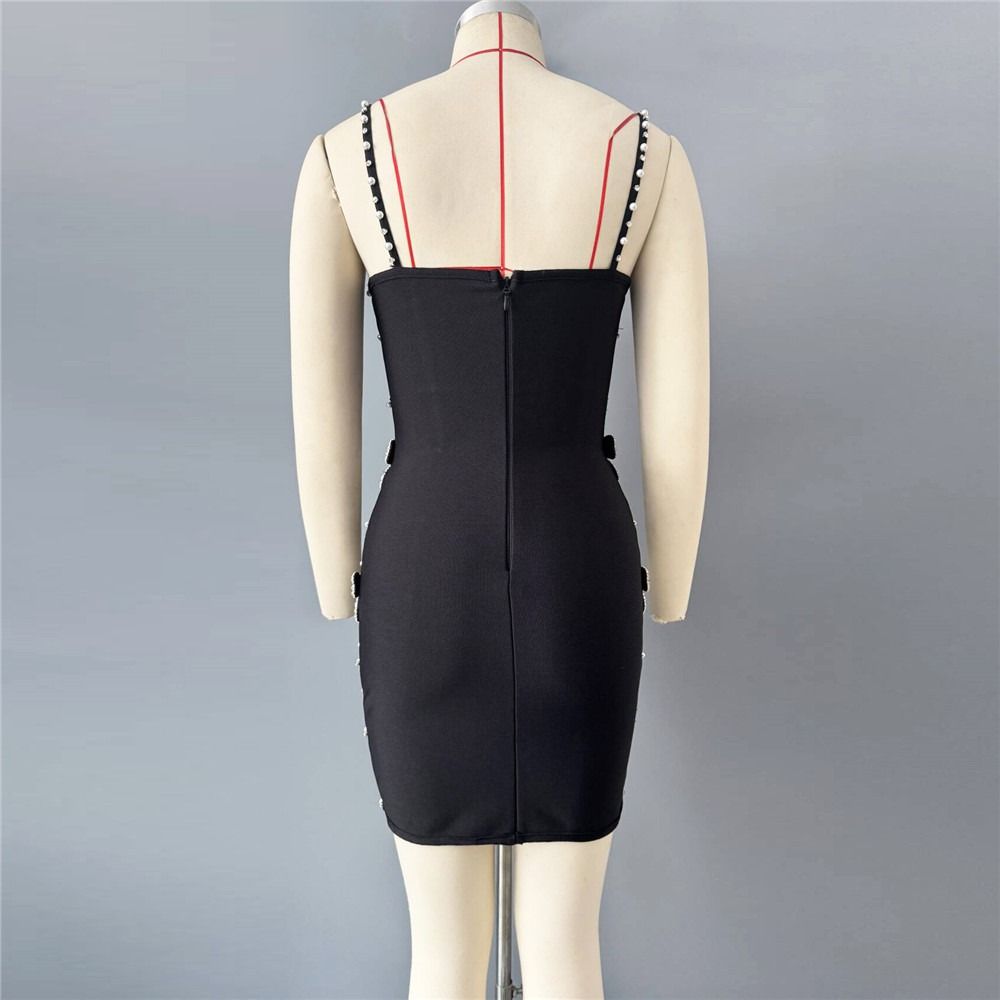 Robe bandage noire extensible avec nœud décoratif argenté en strass