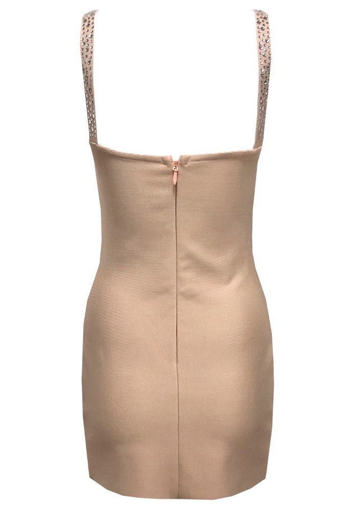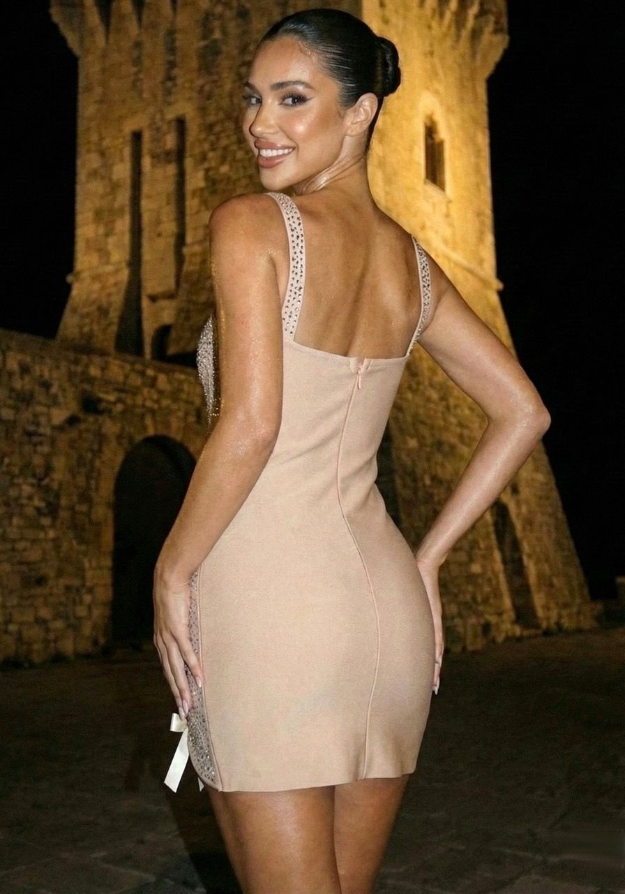 Robe bandage stretch couleur chair avec strass et nœuds décoratifs