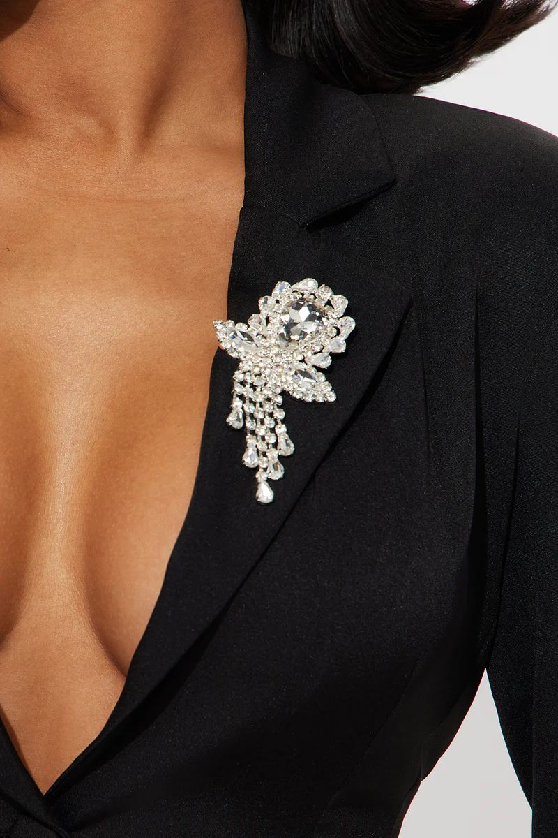 Broche amovible en forme de fleur en strass argenté.