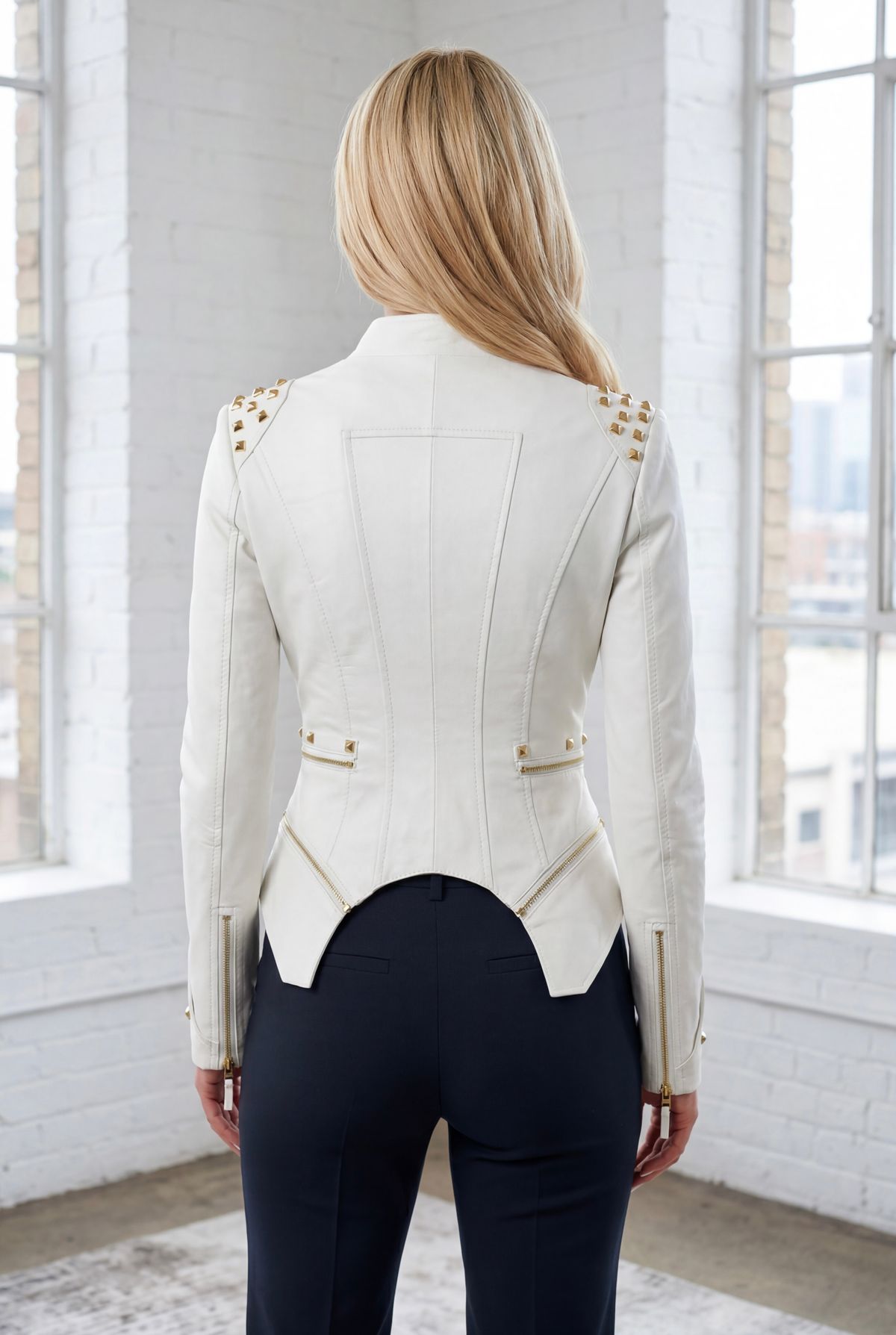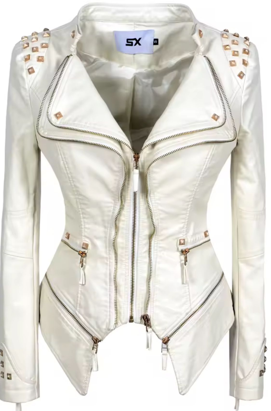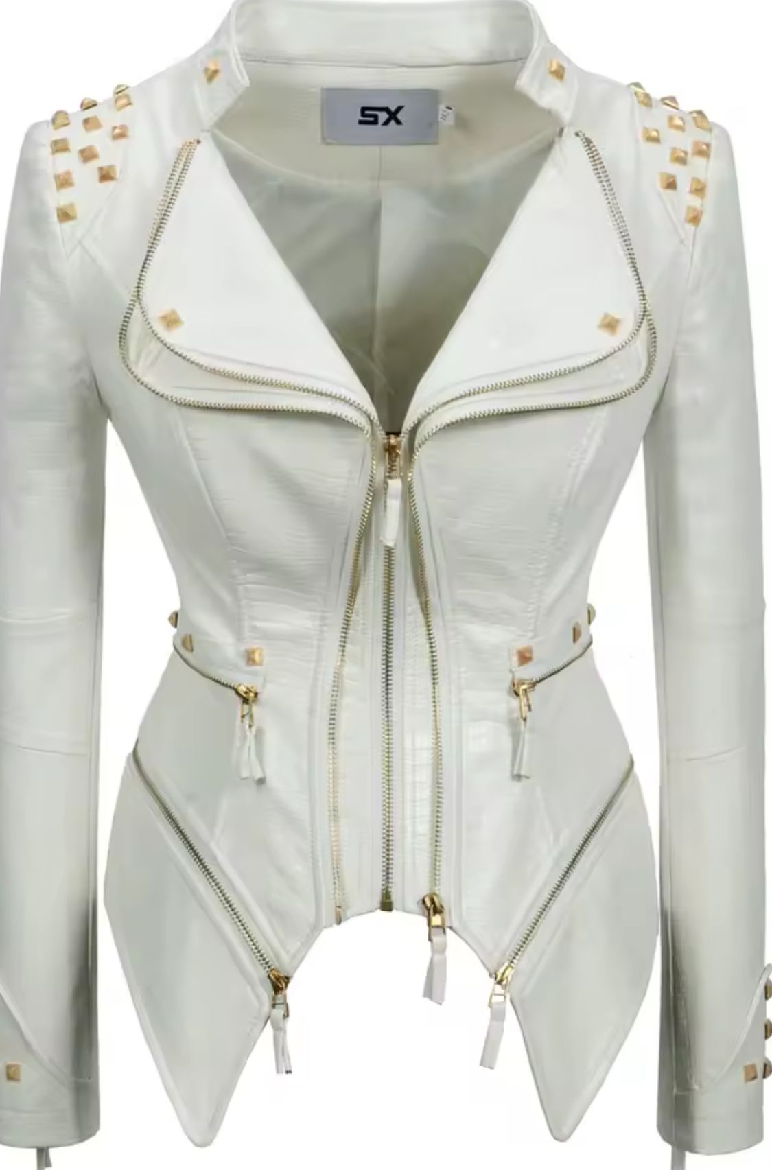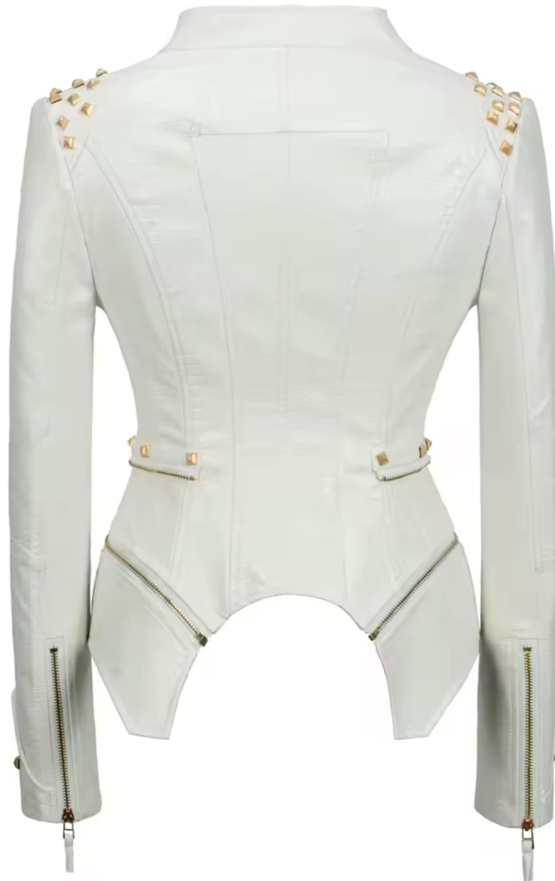 Veste cintrée en similicuir blanc avec fermetures éclair dorées