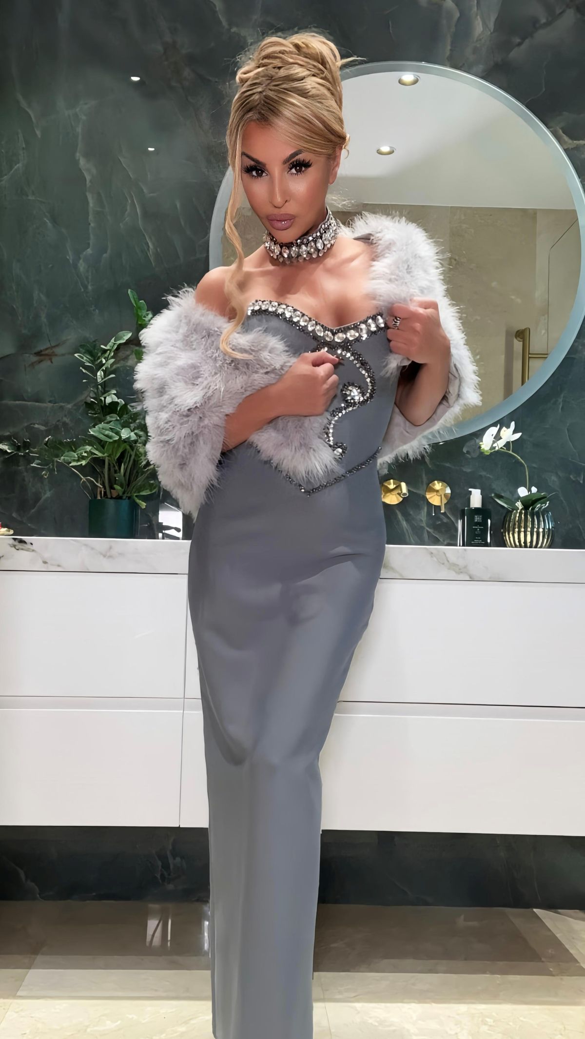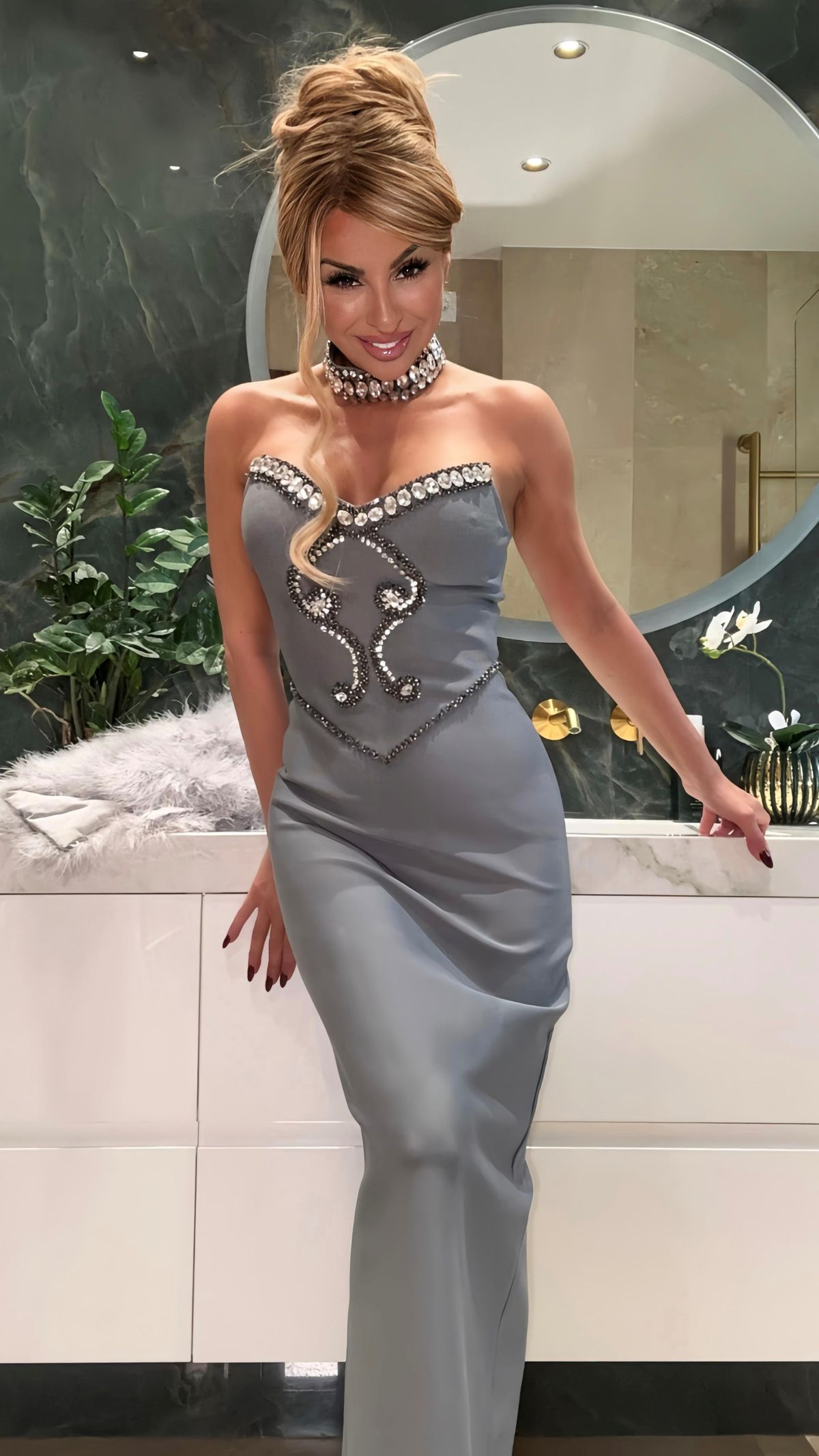 Vestido largo elástico de tejido bandage de pedrería en color gris antracita