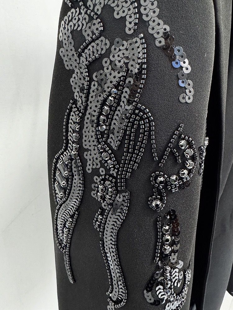 La abotonadura doble frontal añade un toque clásico y lleno de glamour, mientras que la espectacular pedrería en tones ocres, dorados y marfil, meticulosamente dispuesta en los hombros, eleva esta prenda a la categoría deluxe.