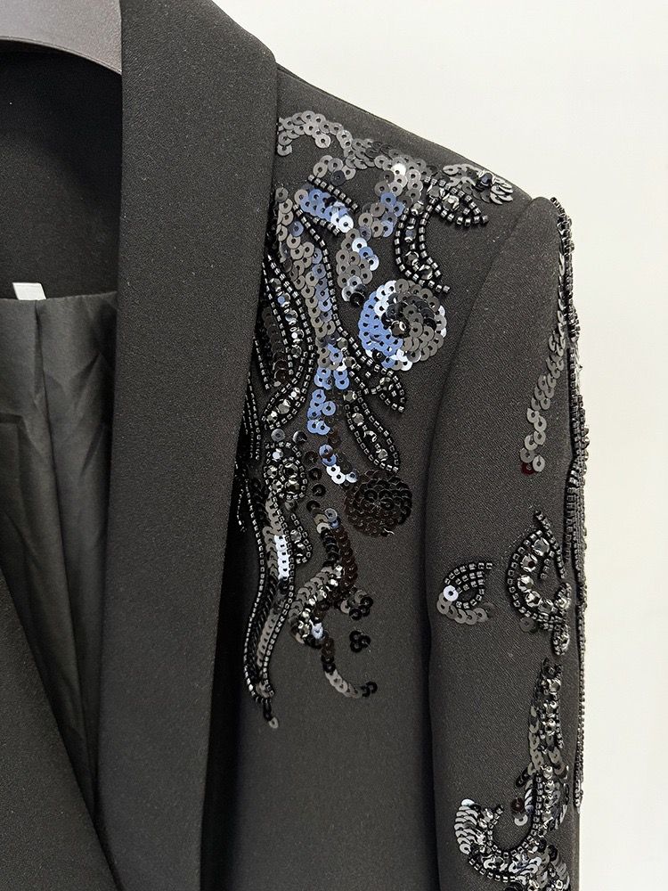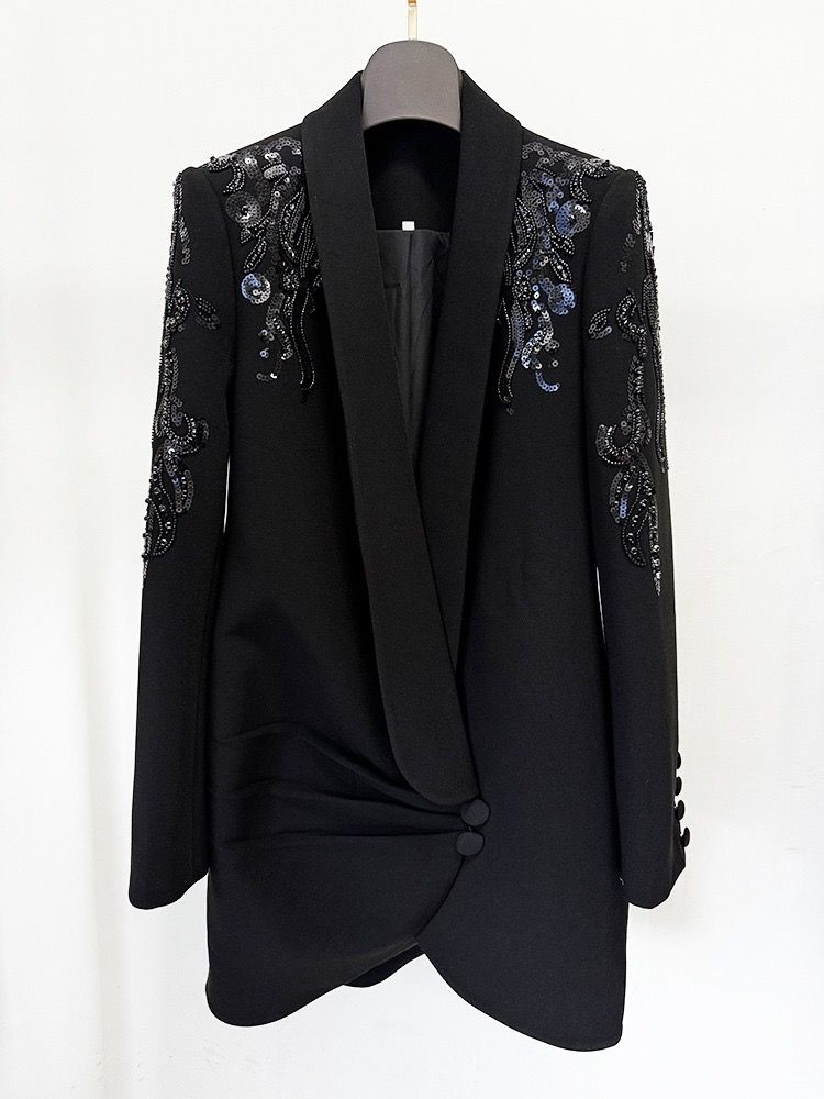 Descubre la sofisticación personificada en este vestido tipo blazer con una espectacular pedrería.