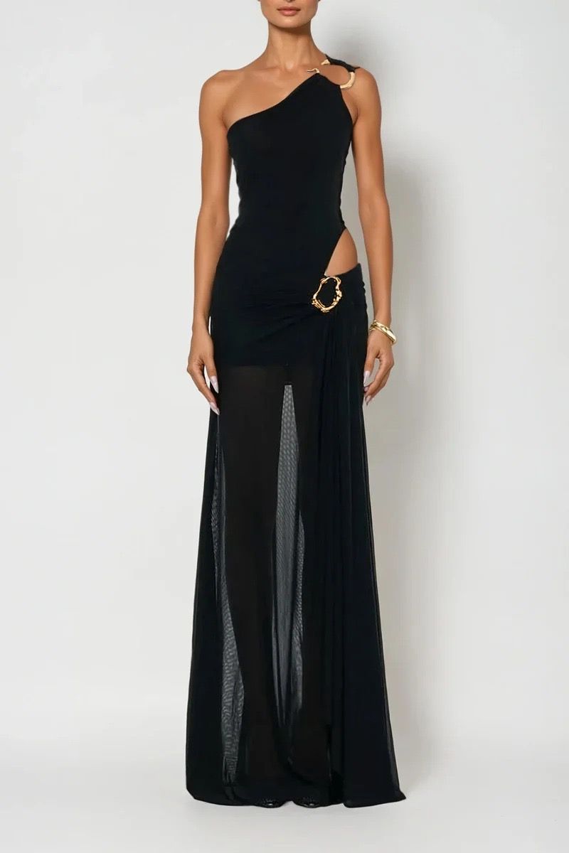Vestido elástico asimétrico negro largo con detalles dorados metálicos