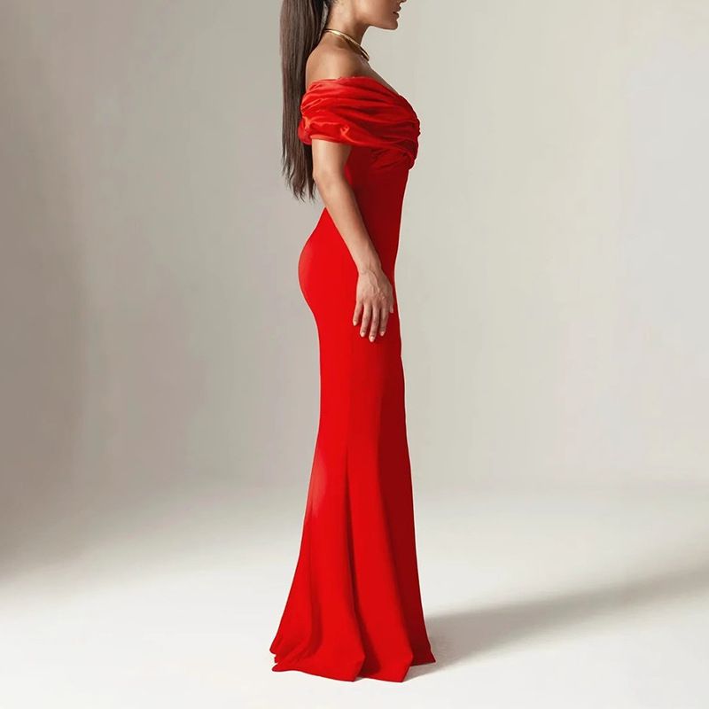 Deslumbrante y sofisticado vestido elástico con hombros al descubierto.