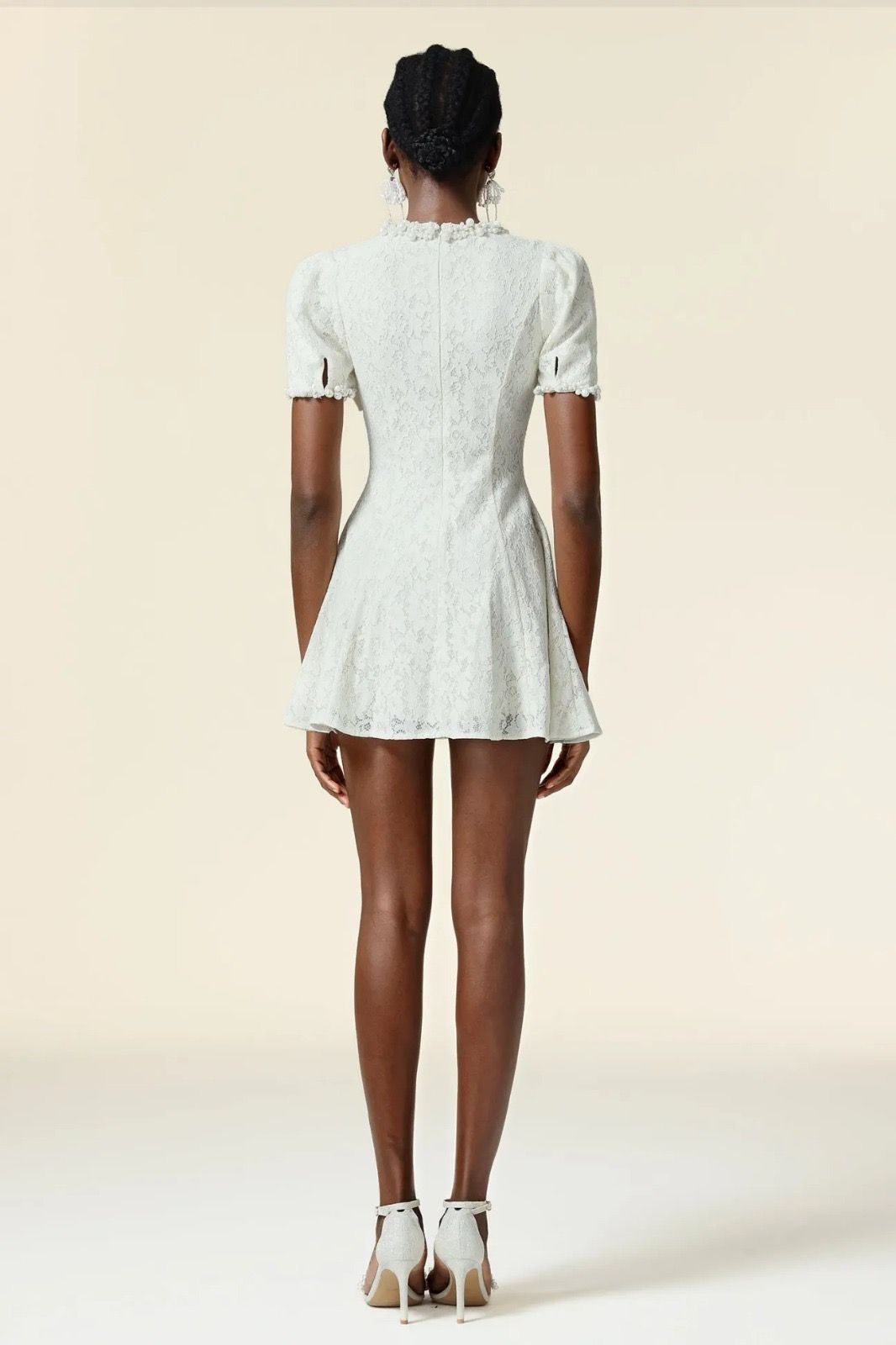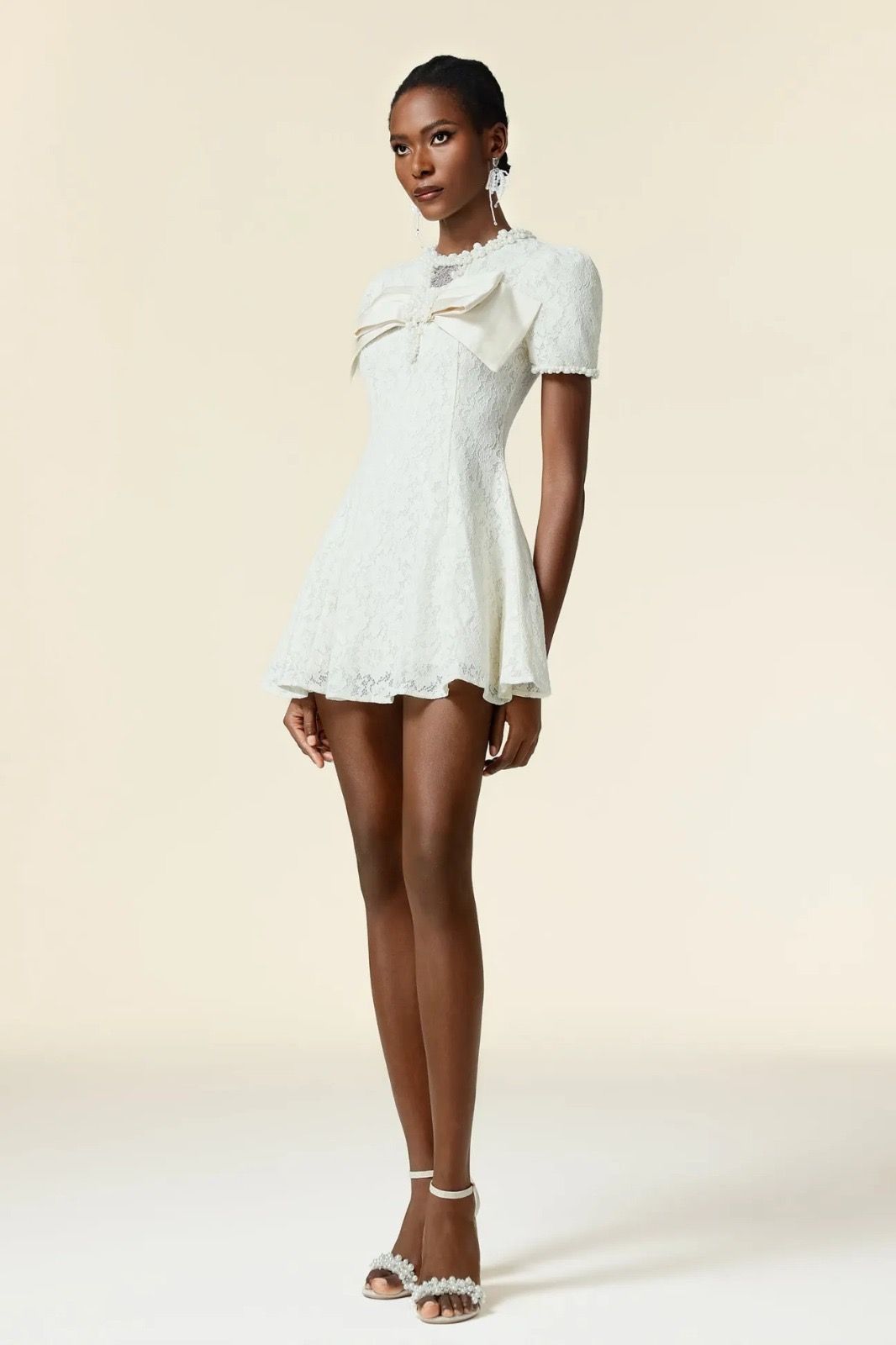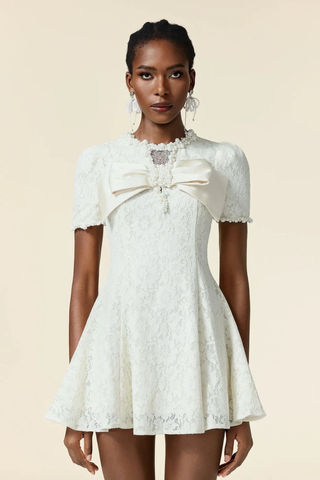 Vestido blanco de manga corta abullonada de encaje de corte evasé con lazo en zona del pecho y perlas decorativas en blanco