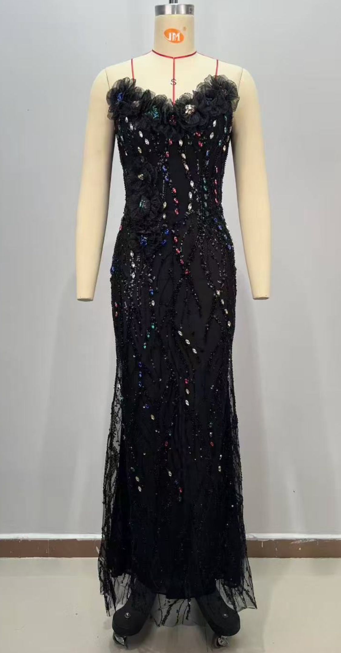 Vestido largo de fiesta de lentejuelas en negro, escote palabra de honor