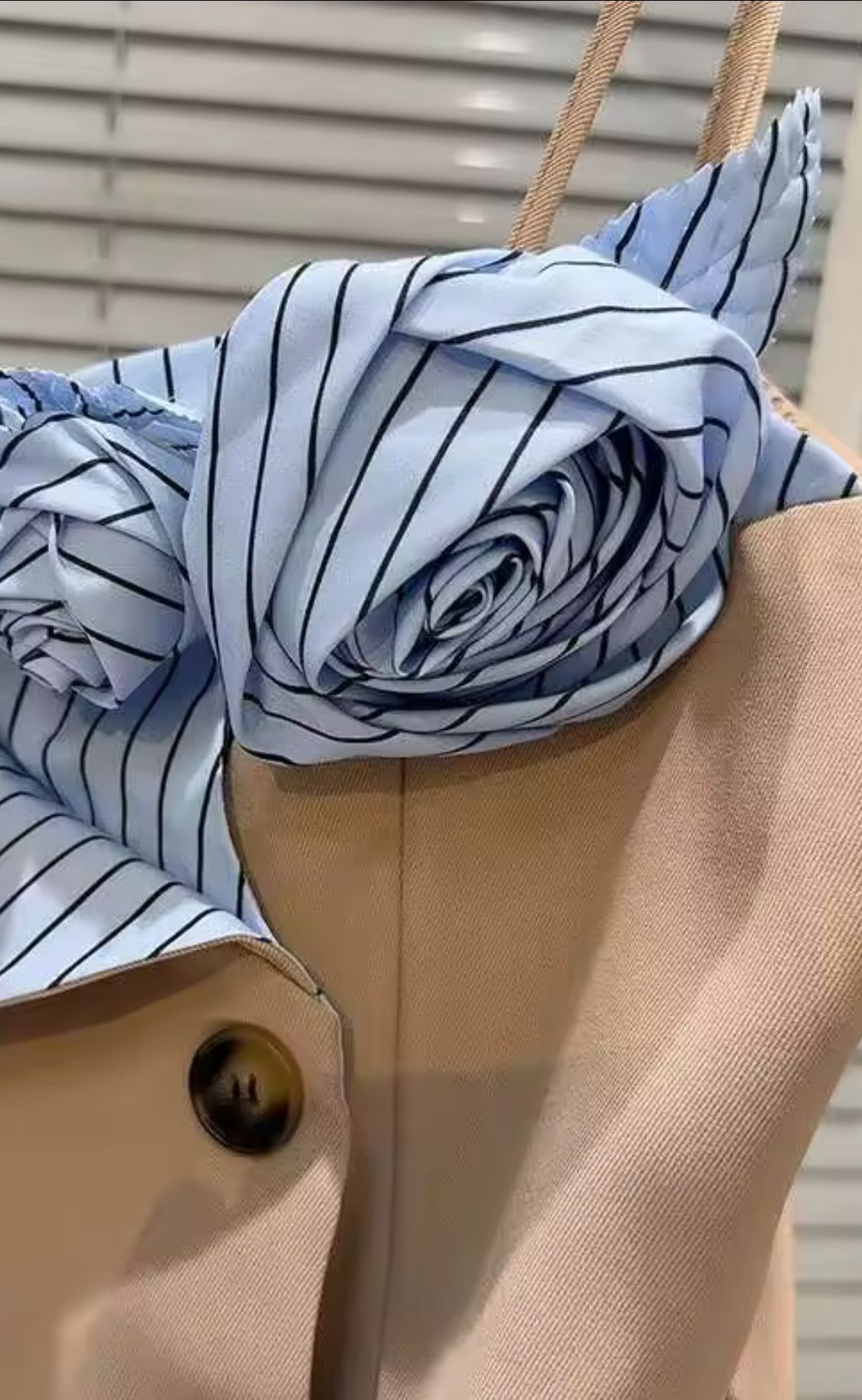 En la zona del escote combina un estampado en azul diplomático como si de una blusa se tratase que brota del interior. Con estampado a rallas diplomáticas tipo ejecutiva.