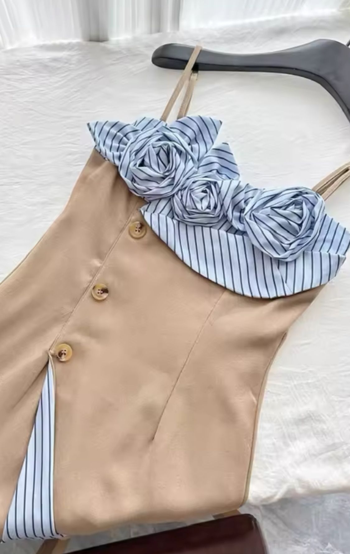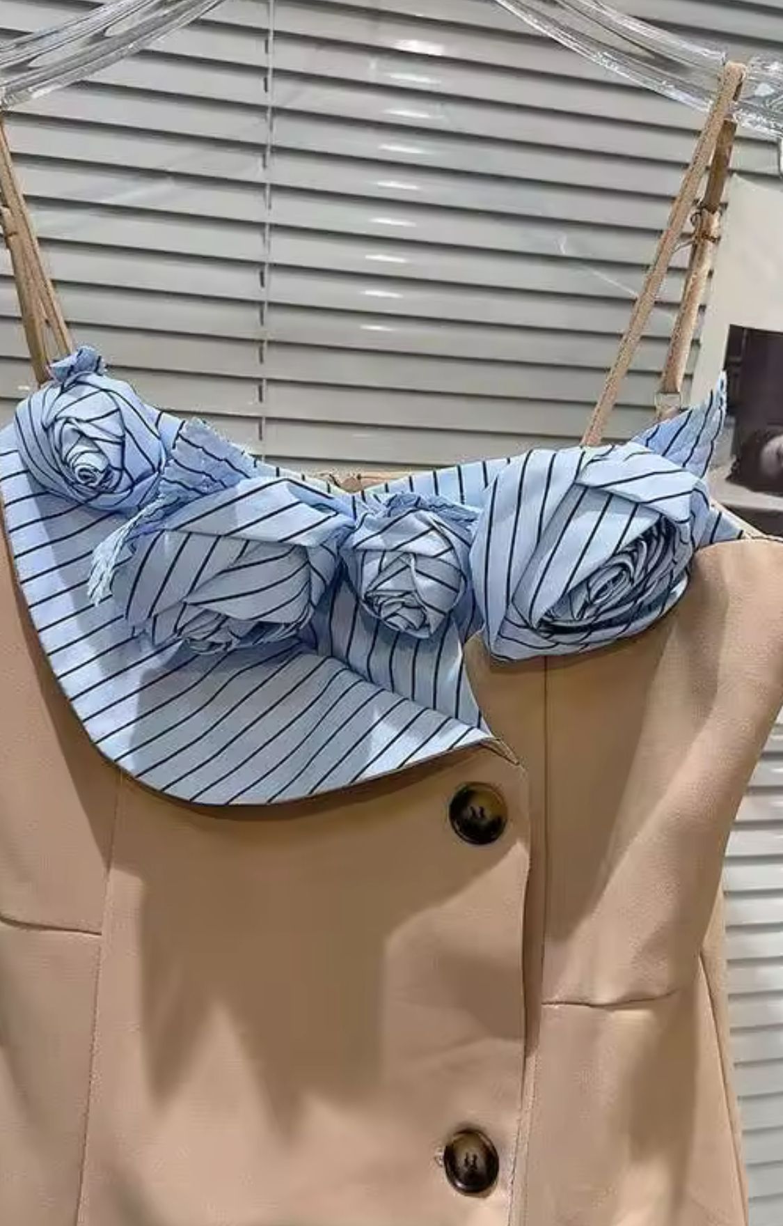 Vestido corto marrón con escote palabra de honor combinado en azul con flores en relieve en la zona del escote