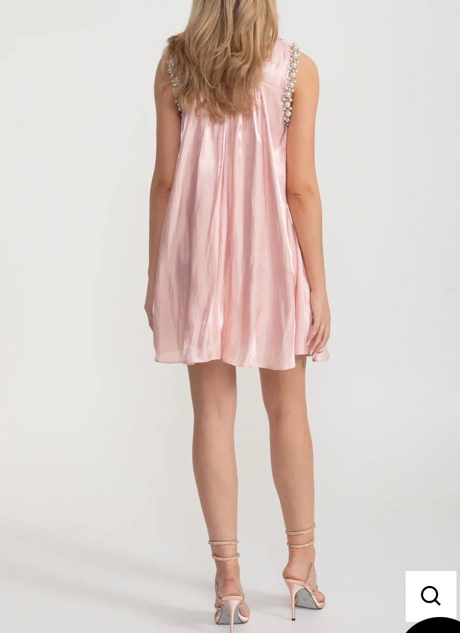 Vestido corto holgado en un delicado rosa bebé con pedrería en torso