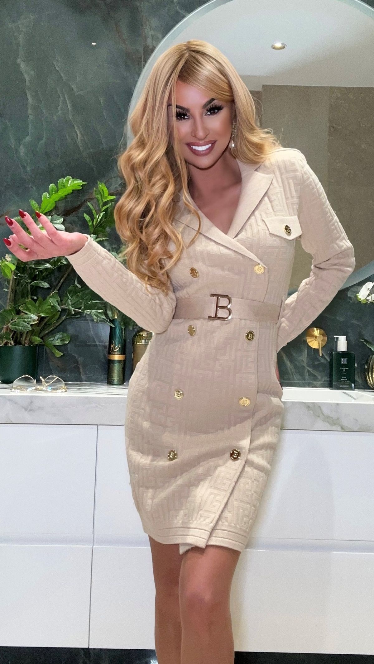 Bolsillos frontales falsos con botones metálicos dorados.