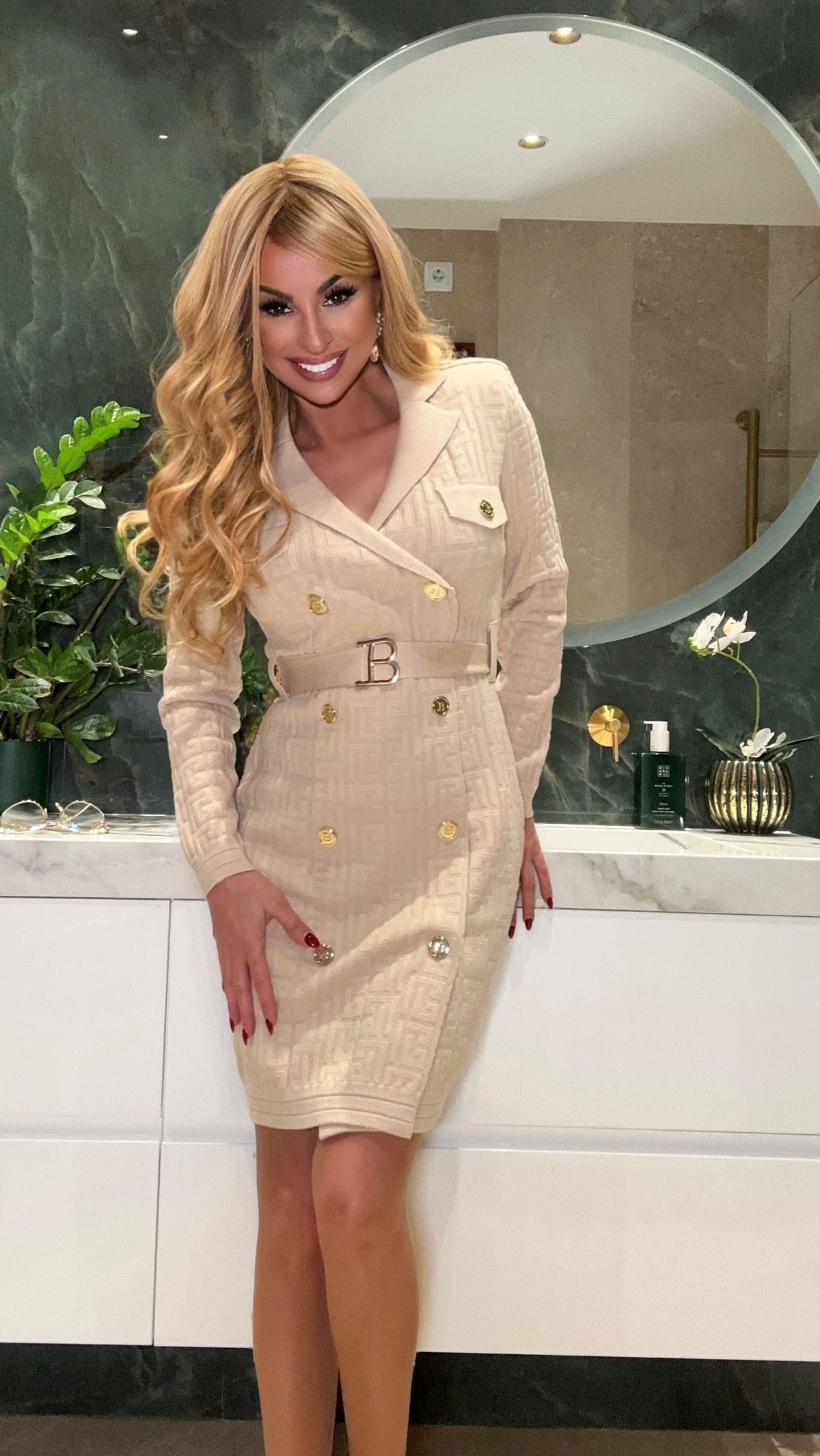 Un hermoso vestido elástico de punto con estampado jacquard.