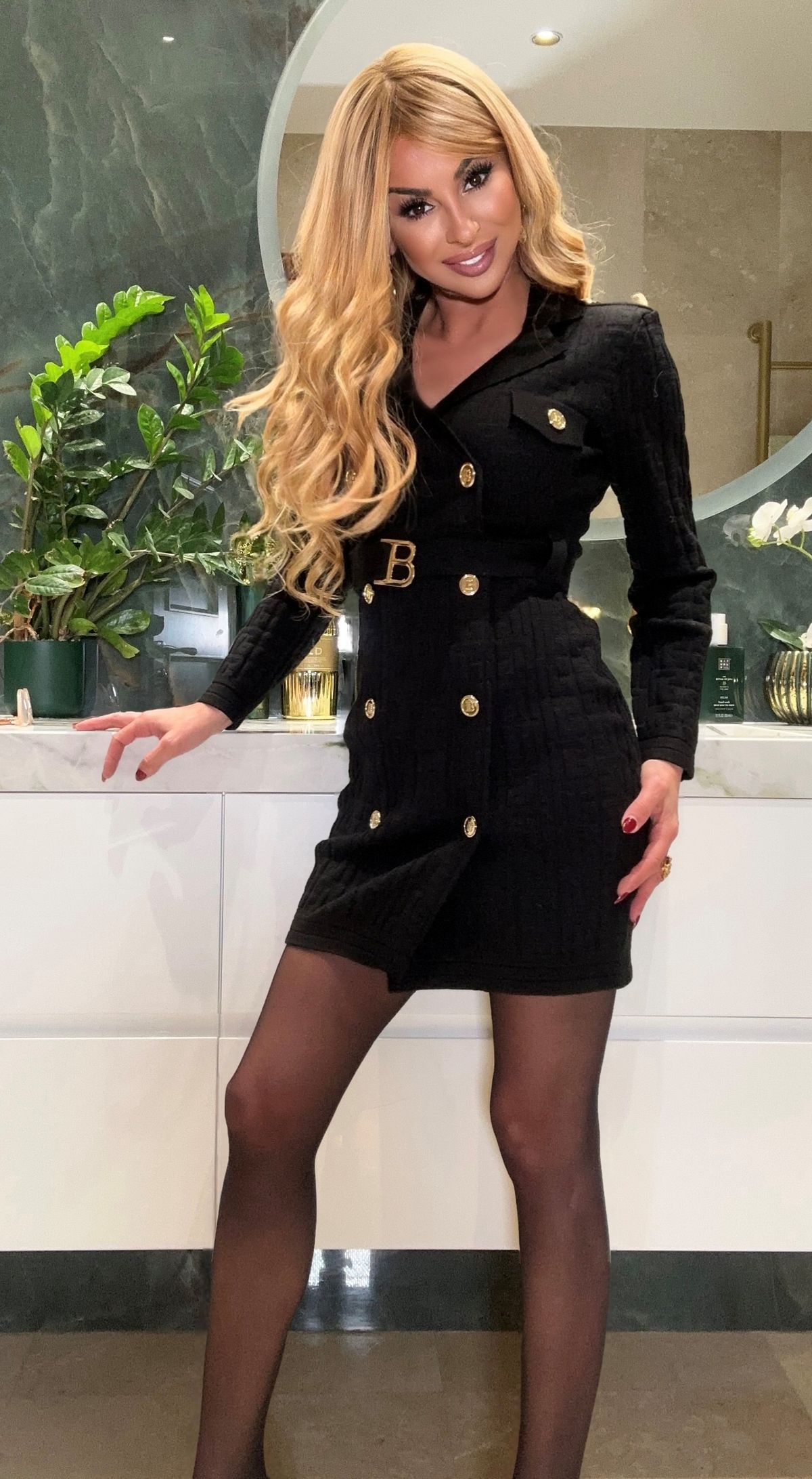 Vestido elástico de punto jacquard de manga larga negro con botones dorados