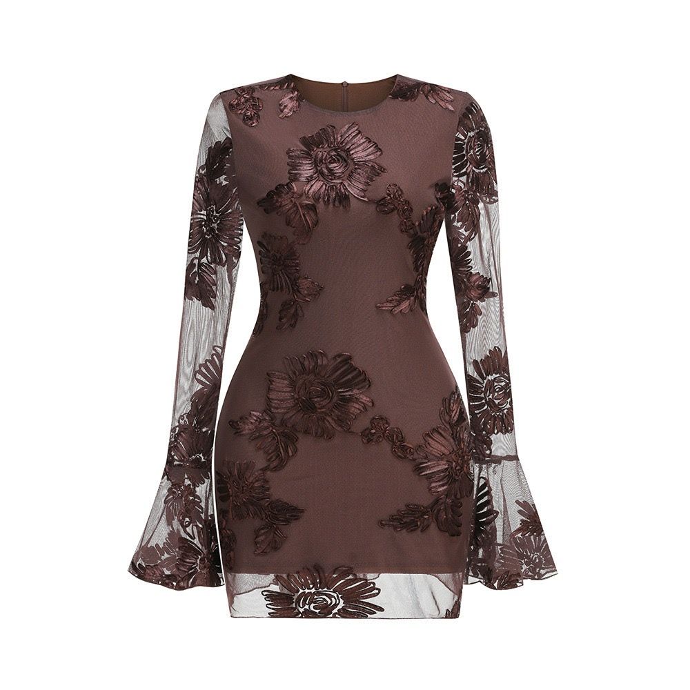 Vestido corto elástico de manga larga de encaje en marrón chocolate
