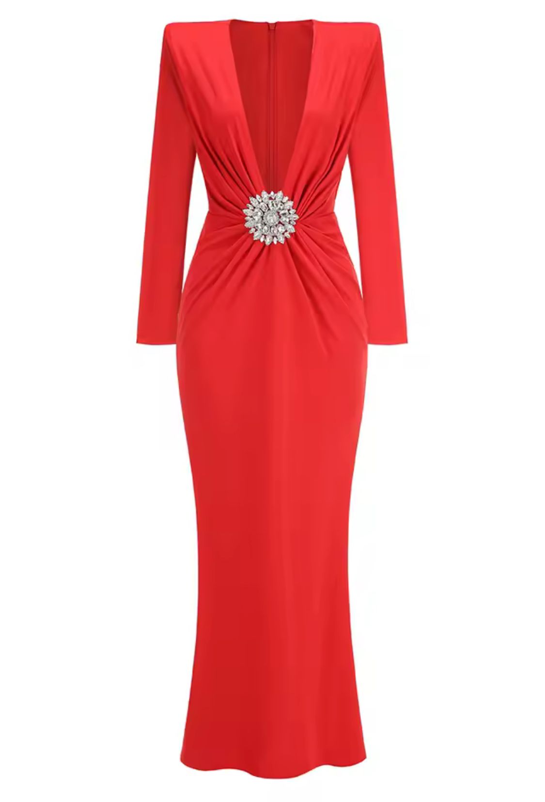 Vestido largo de manga larga elástico con cuello en forma de V con broche decorativo de pedrería plateada en color rojo