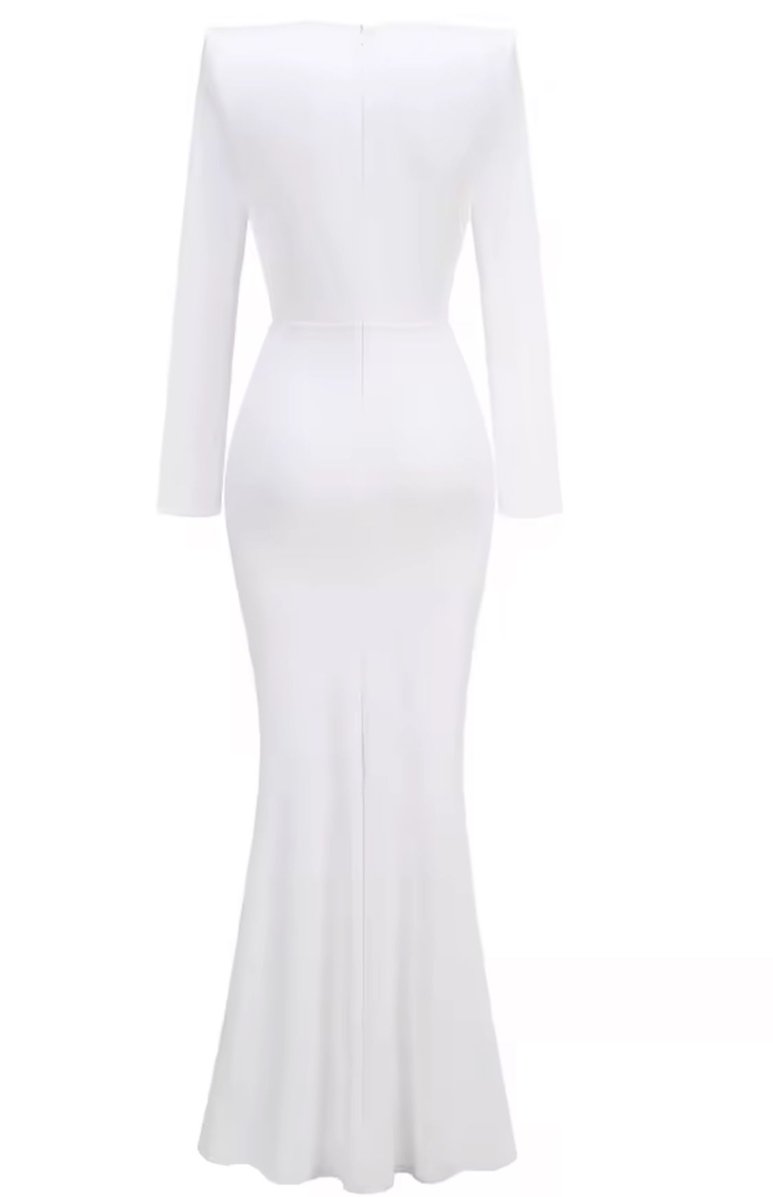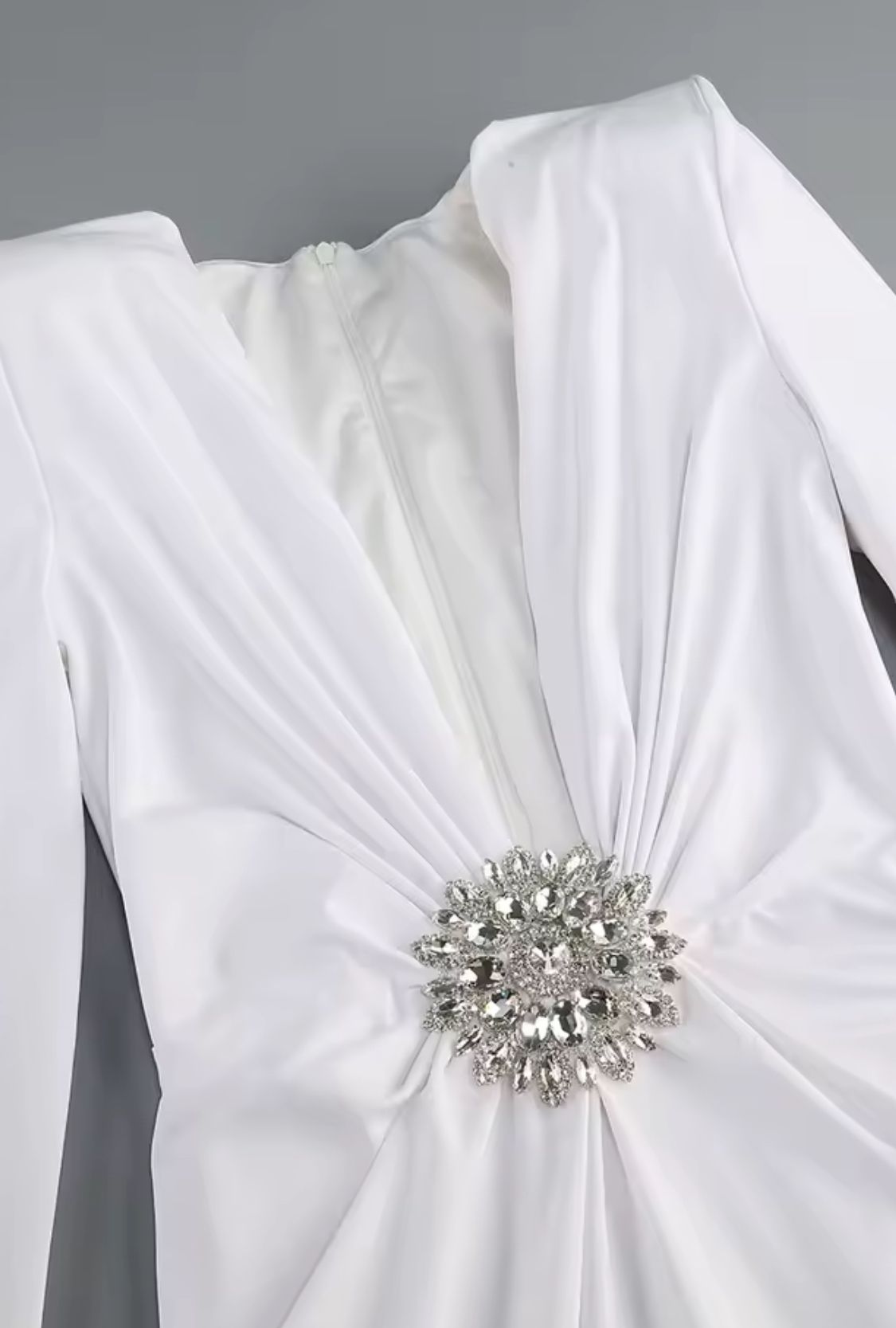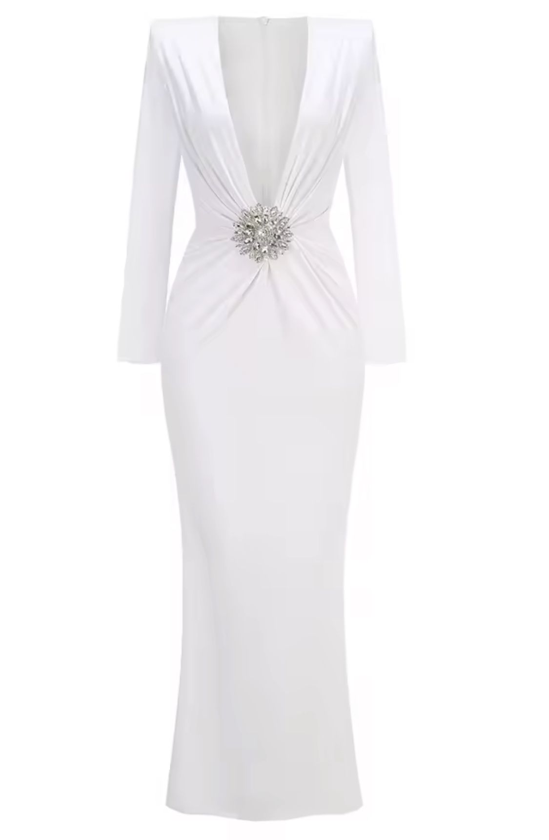 Vestido largo elástico de manga larga con escote en forma de V con broche de pedrería en color blanco