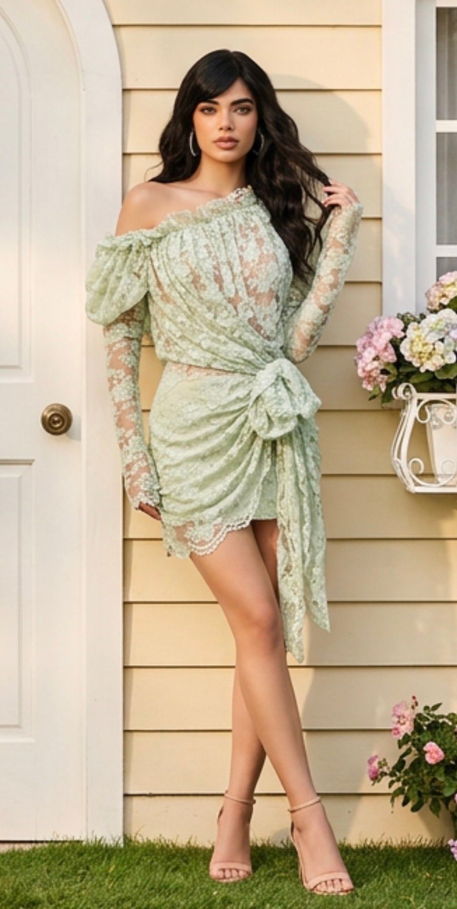 Las mangas largas de encaje transparente contrastan con el cuerpo drapeado, que culmina en un espectacular lazo lateral maxi que ciñe la cintura y crea una silueta asimétrica y favorecedora.